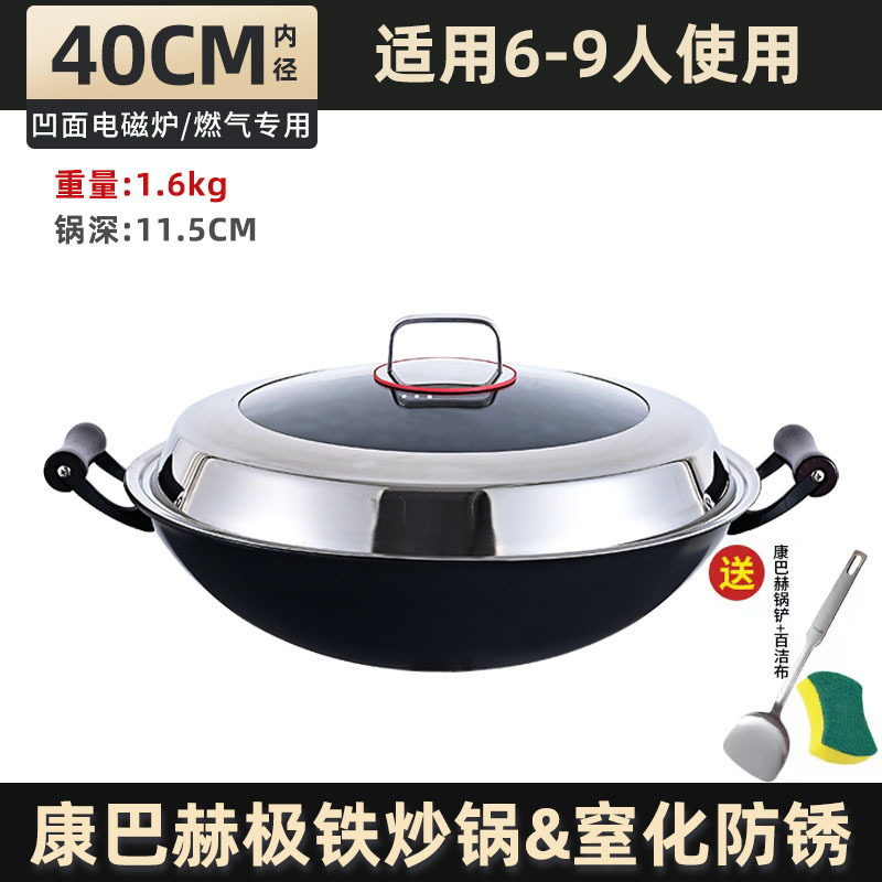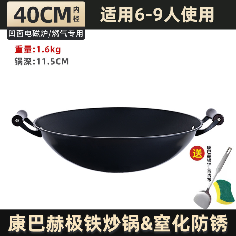 Главная страница > Двухушной Железный вок Kangbach, сковорода с антипригарным покрытием, бытовой чугунный горшок, газовый вок с круглым дном 40