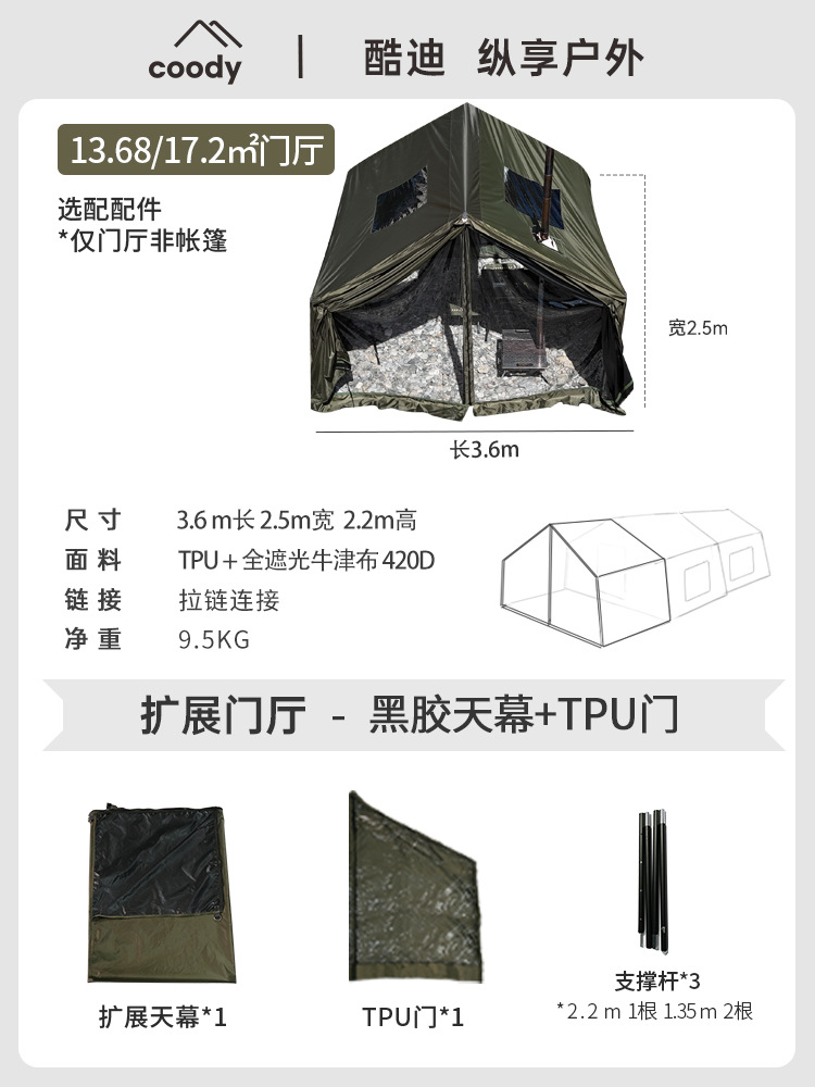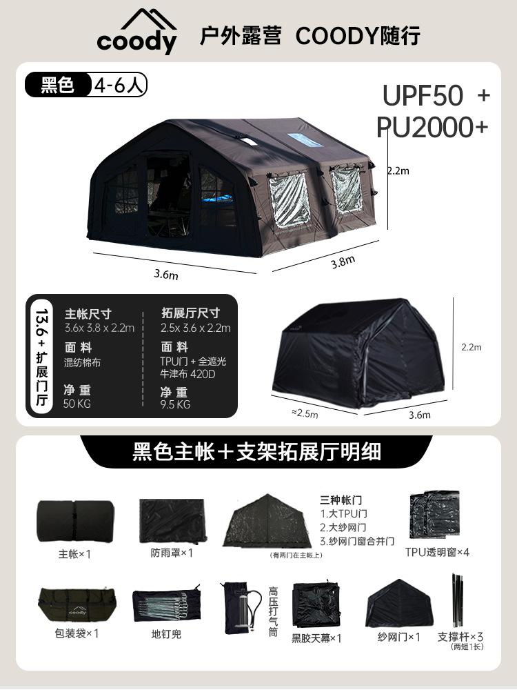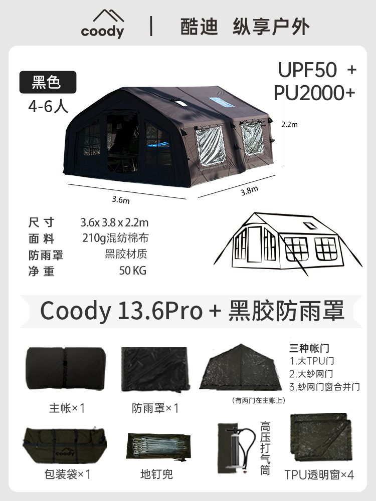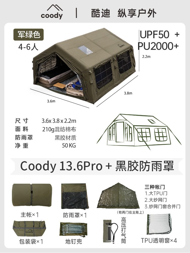 Надувная палатка Coody для кемпинга, цвет «милитари-зеленый», 13.6 кв.м., одна спальня и одна гостиная, палатка-трапеция, водонепроницаемая, для кемпинга, «звездное небо», портативная