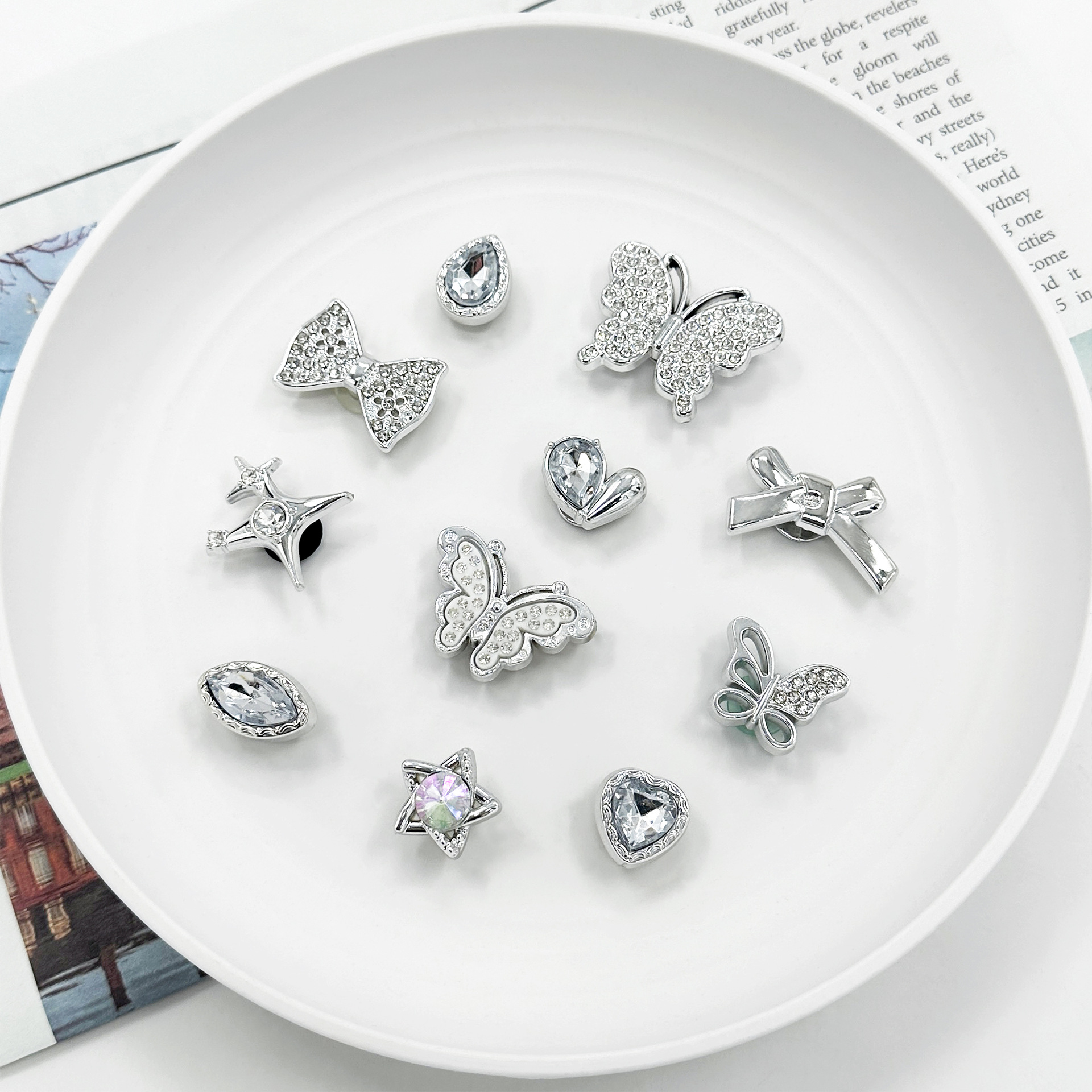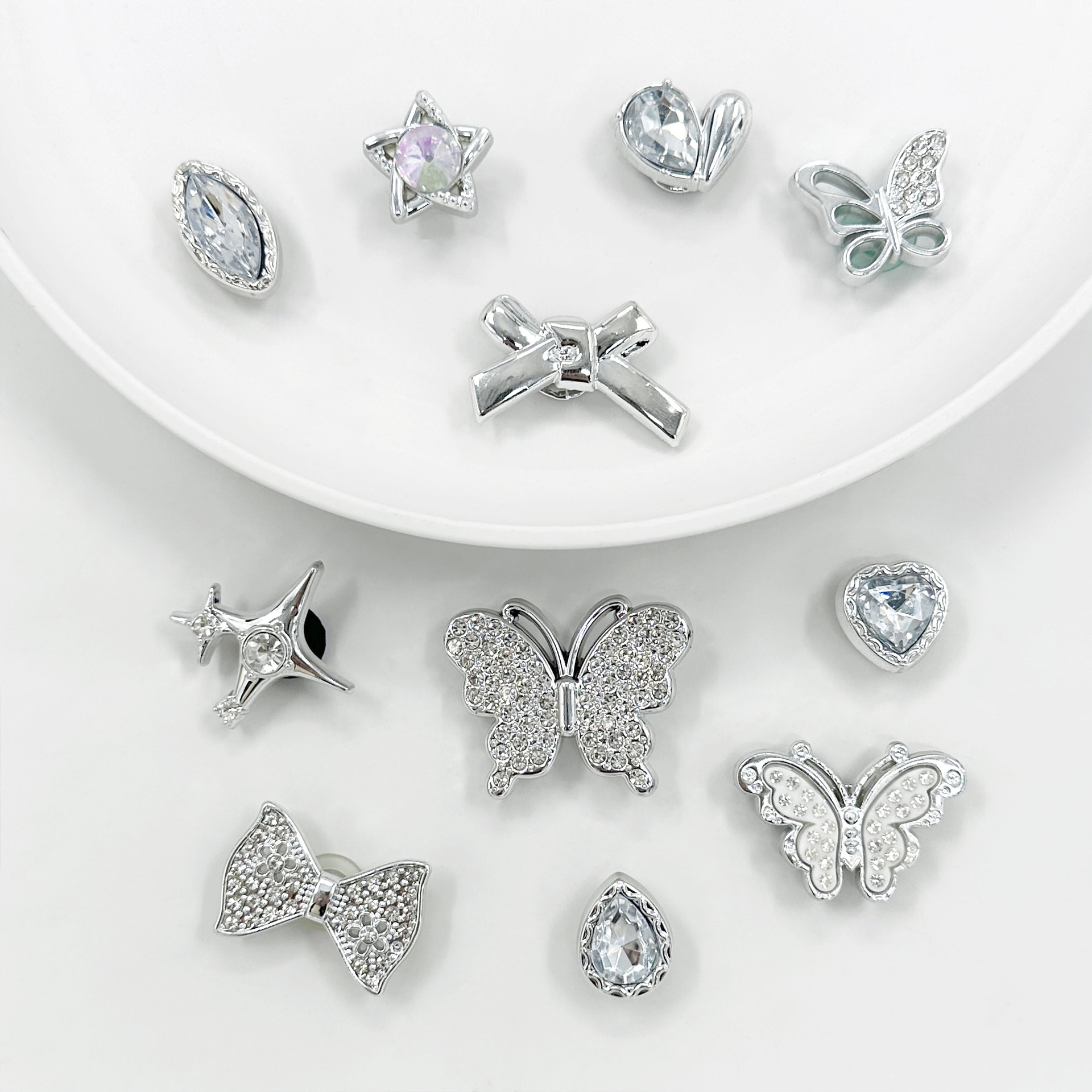 Главная страница > Новые аксессуары для обуви: съемные милые серебряные украшения в виде мультяшных бабочек и цветов со стразами для сабо, 25 лет на рынке