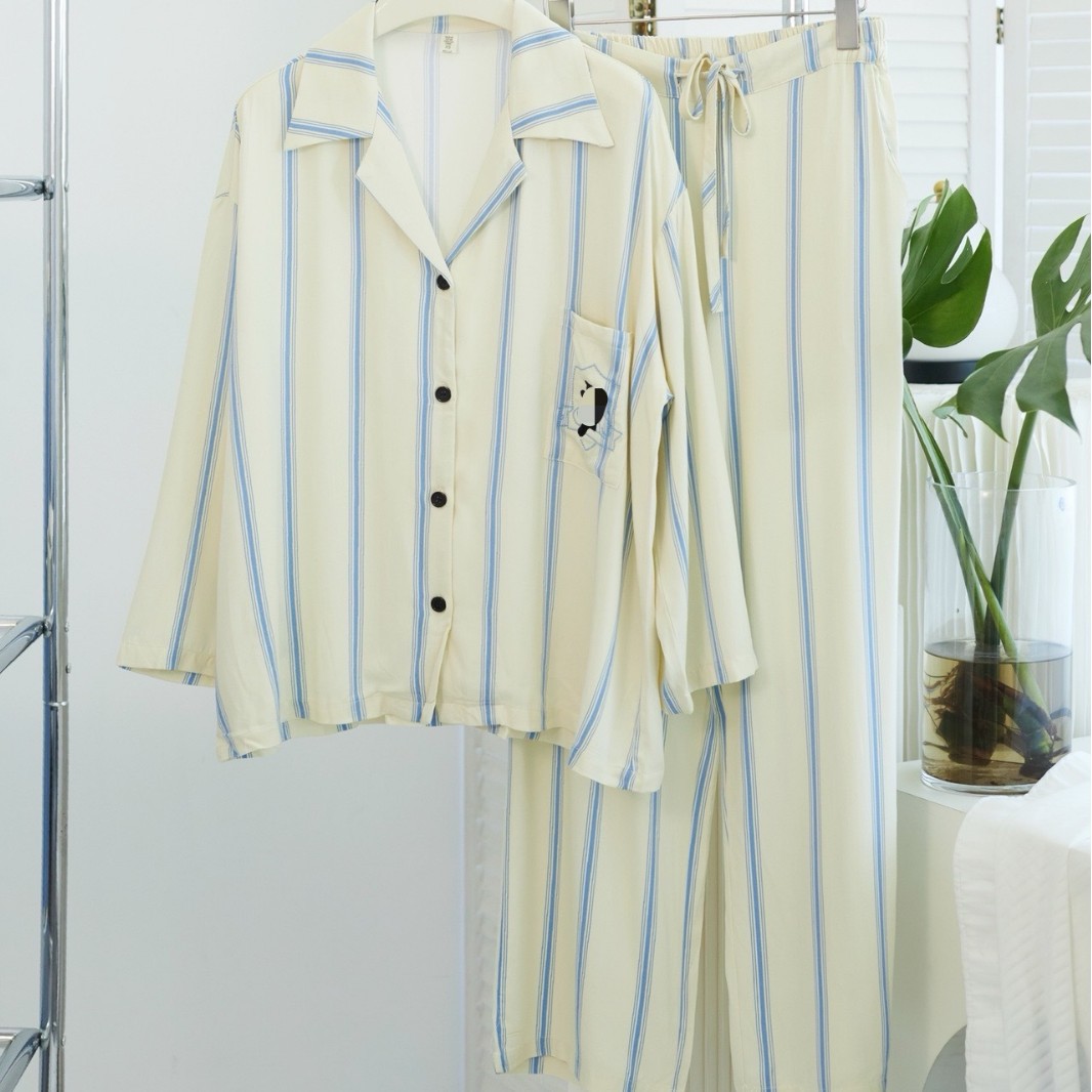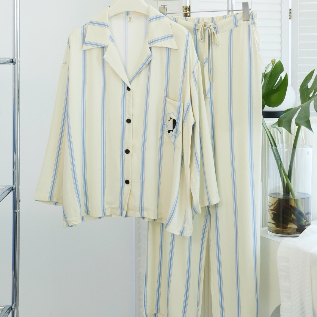 - Длинные рукава и брюки в синюю полоску из вискозы