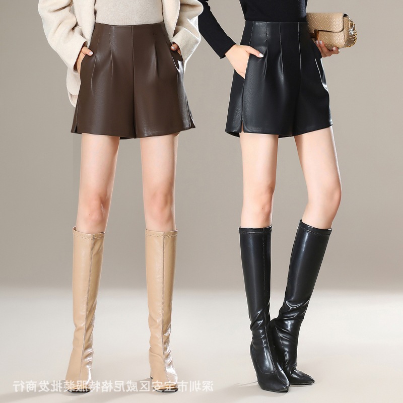 Фирменная мода с высокой талией, кожаные шорты, женские осенние и зимние новые тонкие, широкие ноги, овчинные брюки