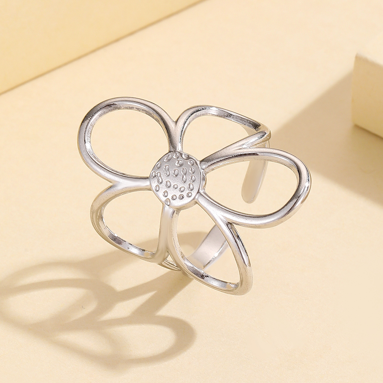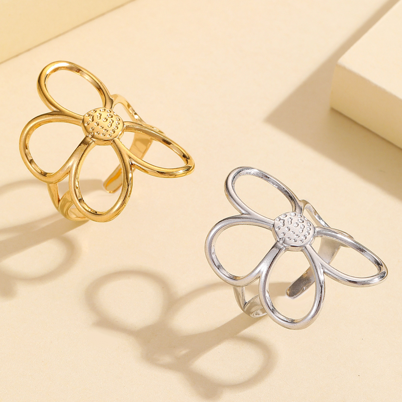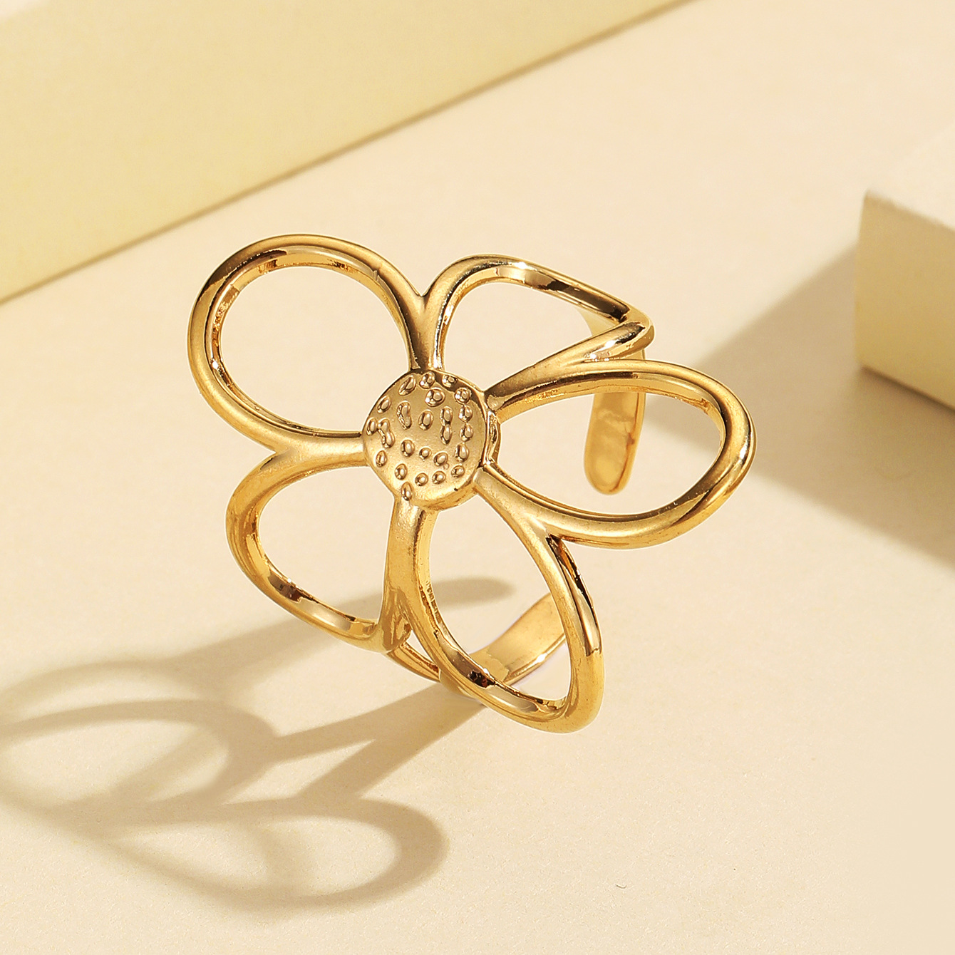 Главная страница > модное и универсальное кольцо из нержавеющей стали с вырезанным цветком и отверстием, ювелирные изделия из 18-каратного золота с вакуумным напылением под давлением масла, женское кольцо, готовое к продаже