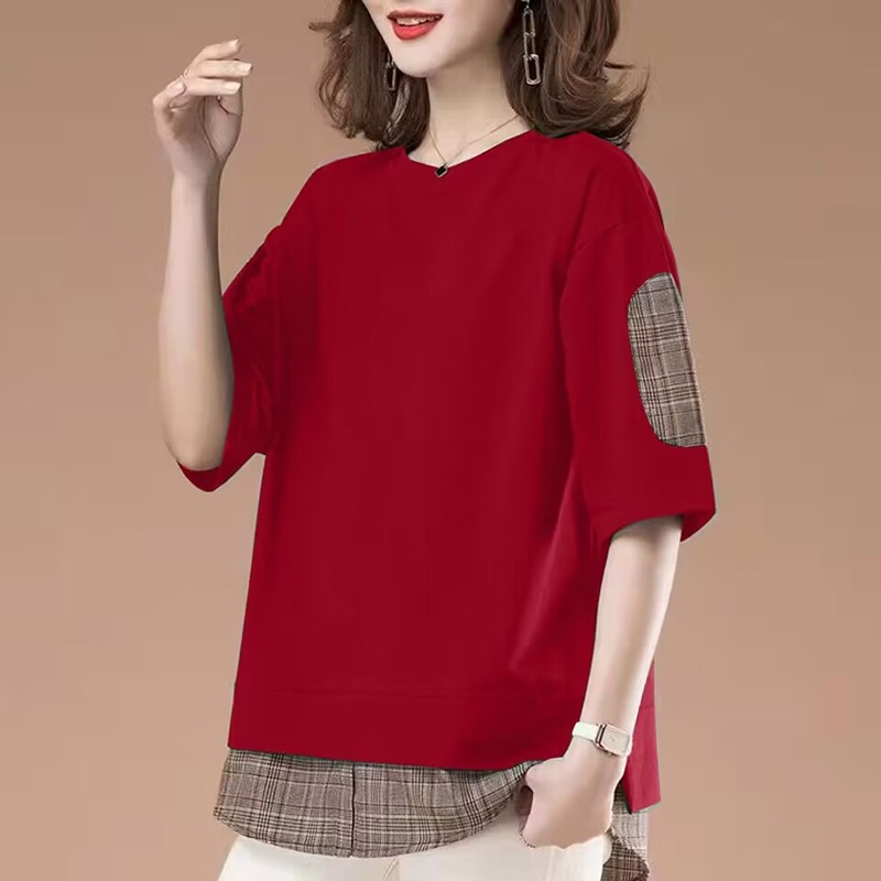 Главная страница > Дизайнерская женская футболка из двух частей с короткими рукавами, новинка лета 2025 года, свободная повседневная футболка для мам, большой размер, утягивающий топ
