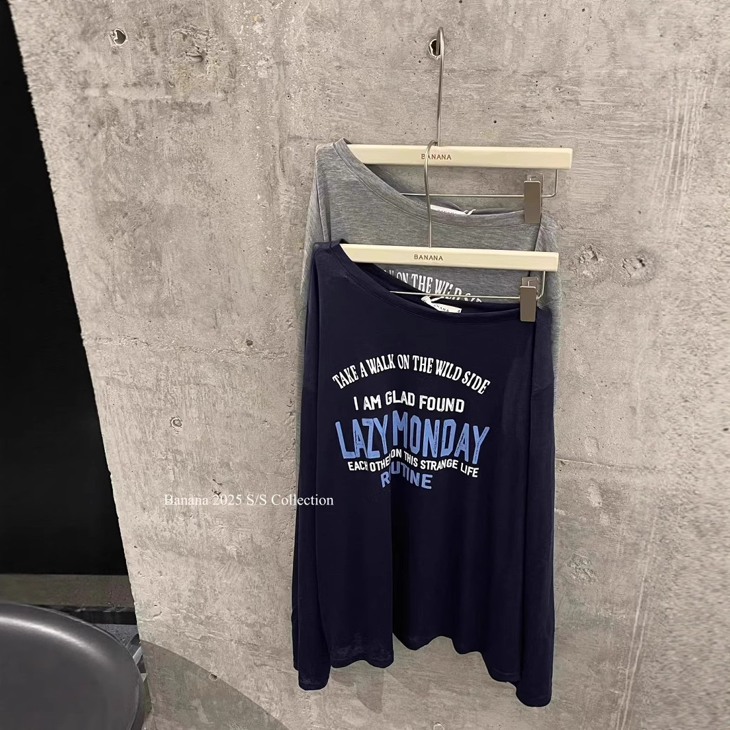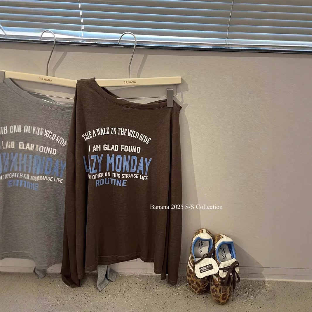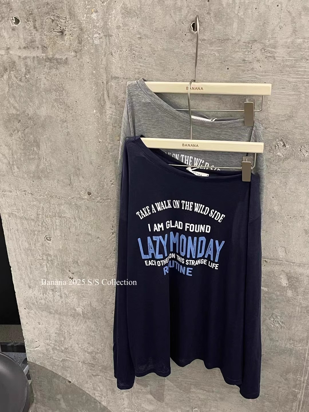 Главная страница > Южная Корея Dongdaemun, летняя новая модная забавная футболка с длинными рукавами и косыми плечами, женская ленивая солнцезащитная рубашка, блузка, топ ins