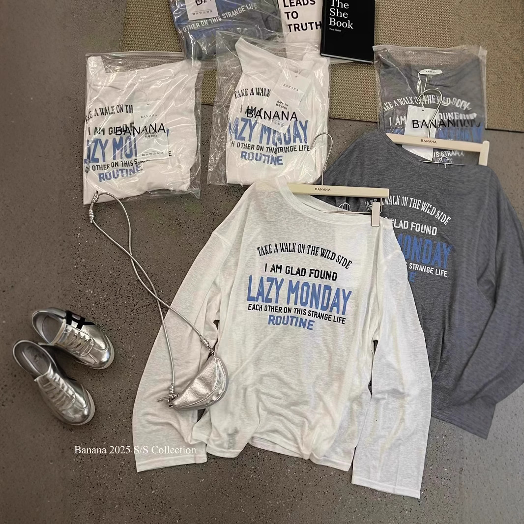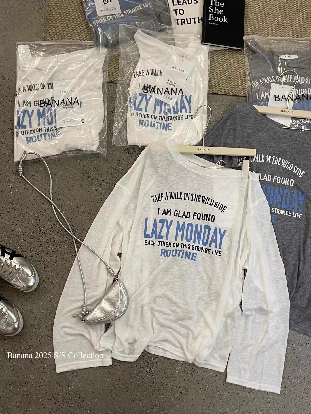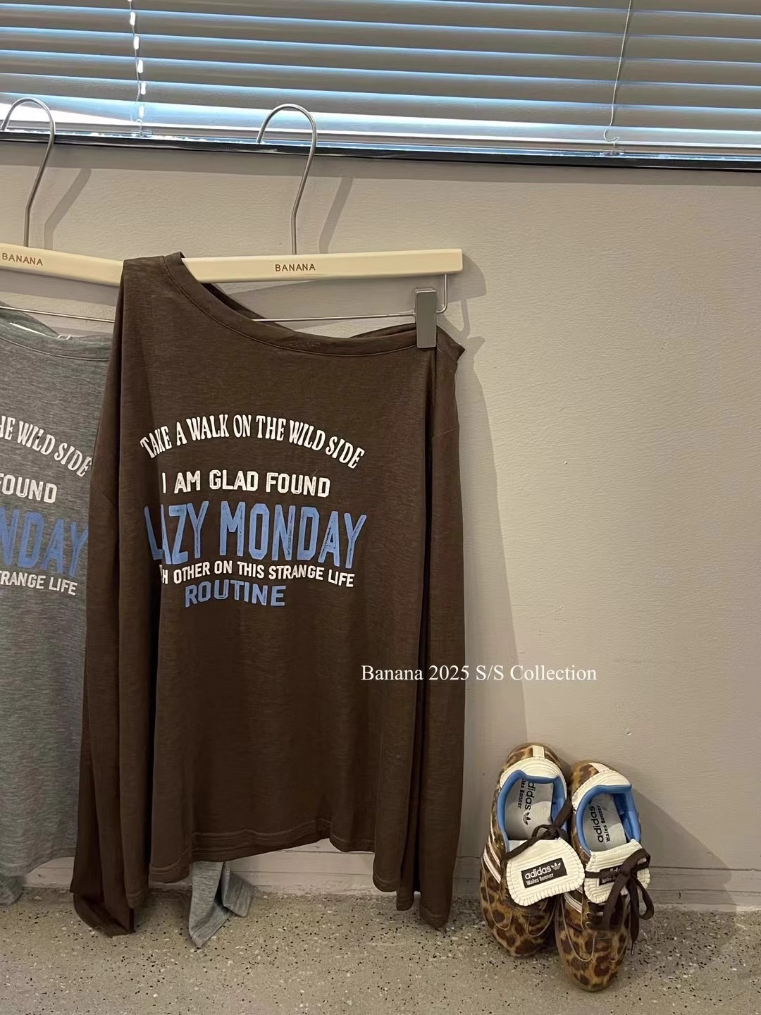 Главная страница > Южная Корея Dongdaemun, летняя новая модная забавная футболка с длинными рукавами и косыми плечами, женская ленивая солнцезащитная рубашка, блузка, топ ins