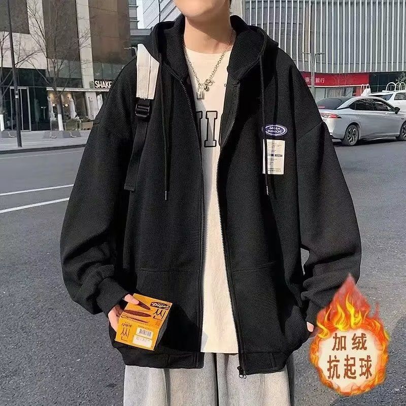 Главная страница > Мужская толстовка-кардиган из вафельного трикотажа на весну и осень, с молнией, свободного кроя, с капюшоном, модная.