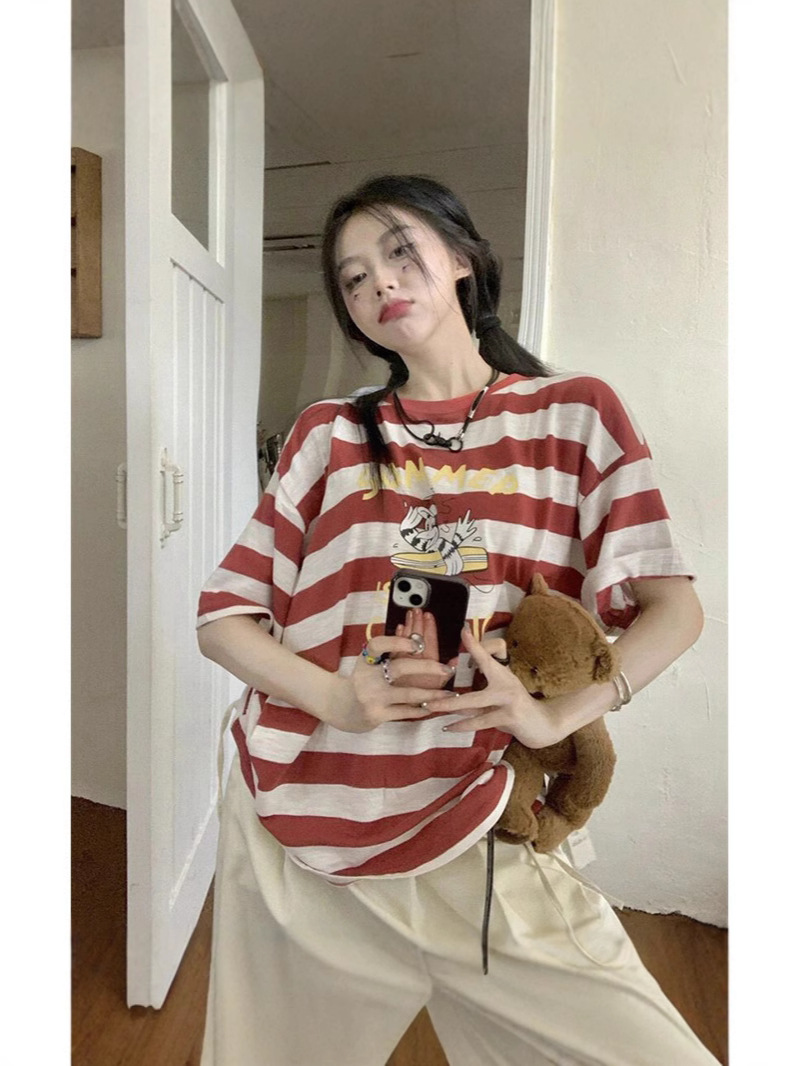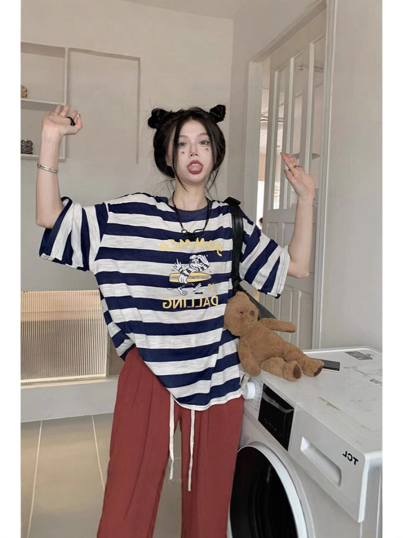 Главная страница > Полосатая женская футболка с короткими рукавами, летний дизайн, свободный тонкий топ оверсайз с половиной рукавов