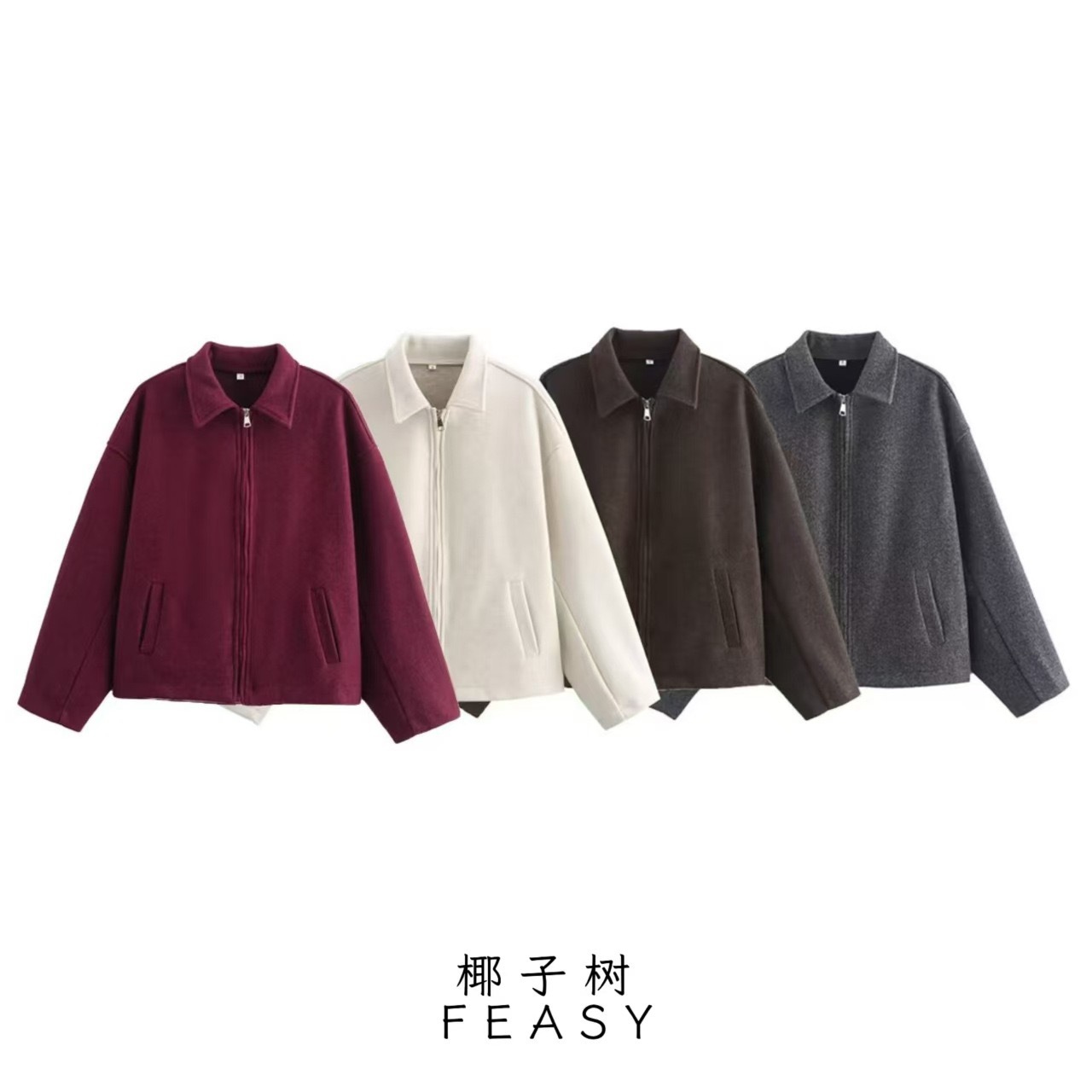 ZA速卖通爆款跨境外贸欧美风女装纯色阔型拉链毛呢夹克外套