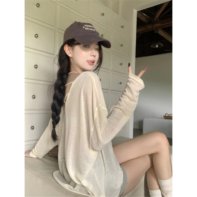 Красотка на спине тюля с длинными рукавами солнцезащитная футболка блузка женская 2025 новая летняя ленивая тонкая свободная средняя длинная топ