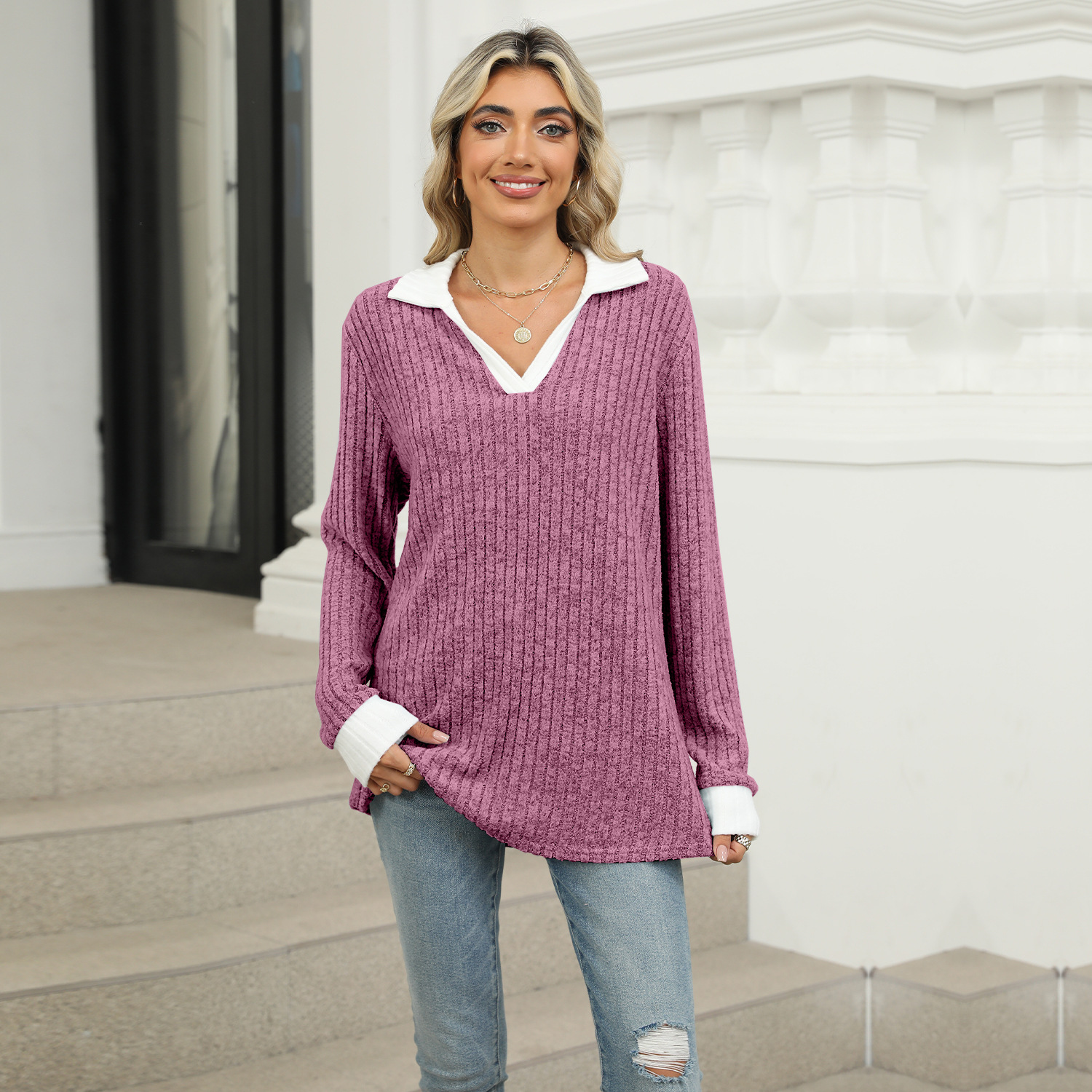 Amazon Европа и США трансграничная внешняя торговля 2024 осень и зима новые контрастные лацканы с длинными рукавами свободная футболка топ женский спот