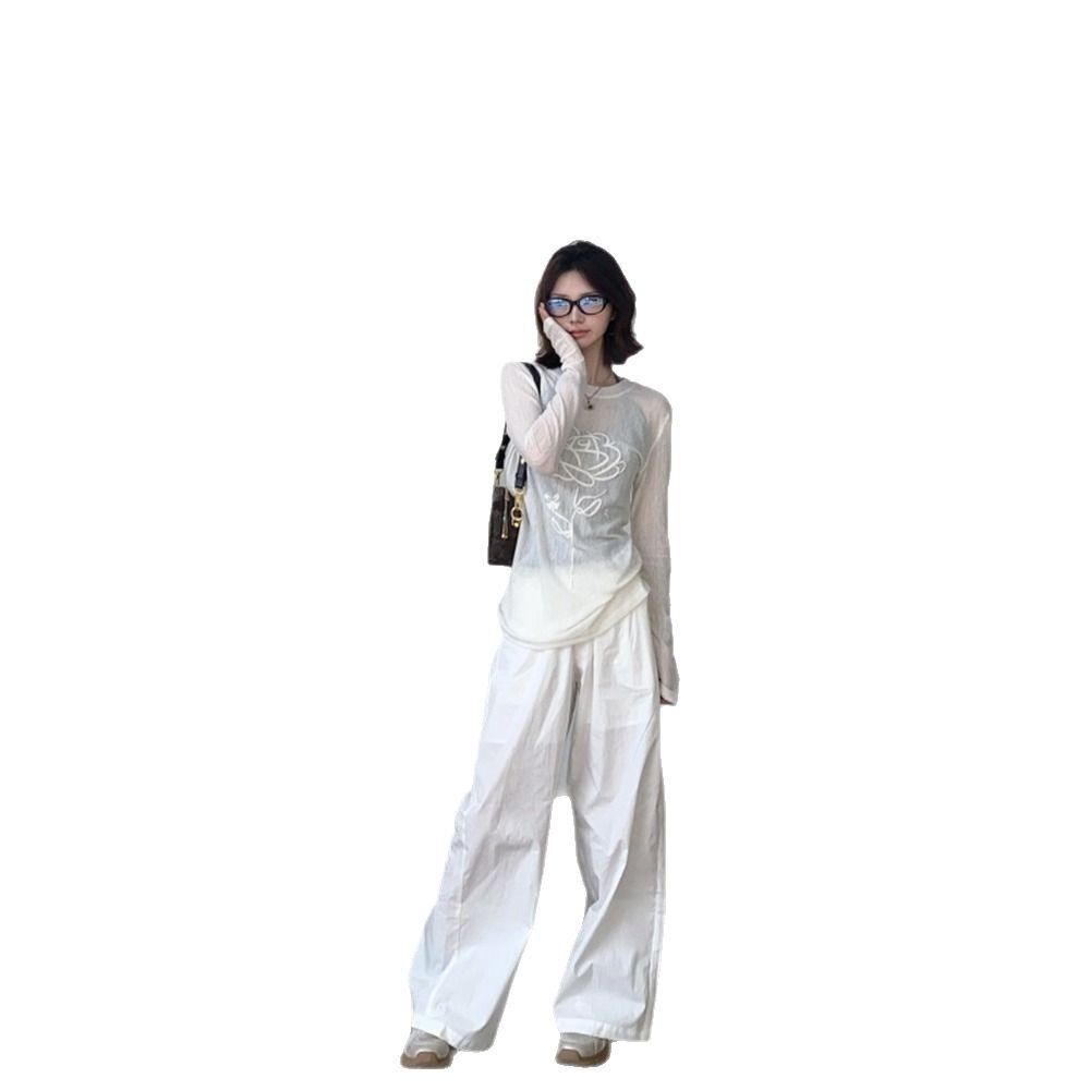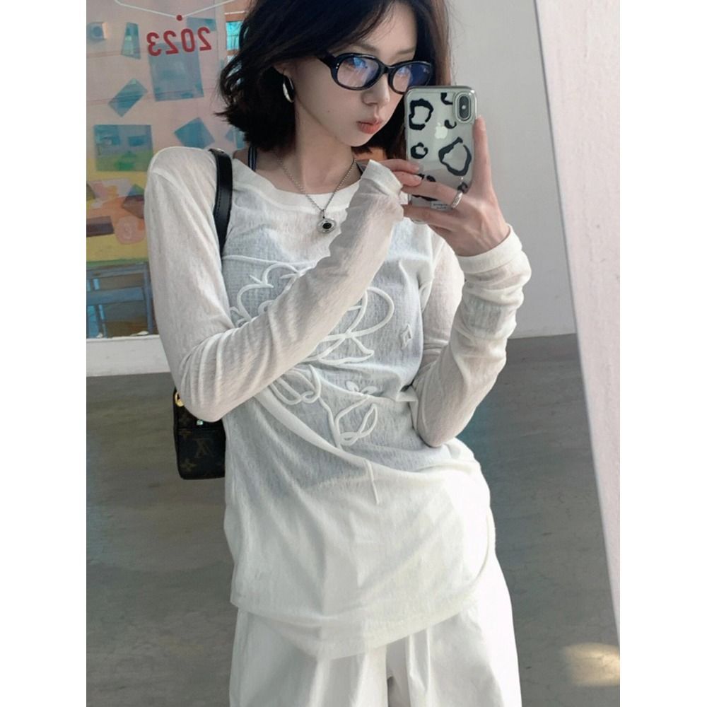 Главная страница > Белая футболка с длинным рукавом на плече тонкая солнцезащитная блузка женский летний 2025 новый дизайн трехмерный цветочный топ
