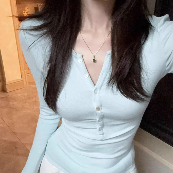 Американская горячая девушка хочет полуоткрытый воротник, а талия с длинными рукавами. Футболка с длинными рукавами.