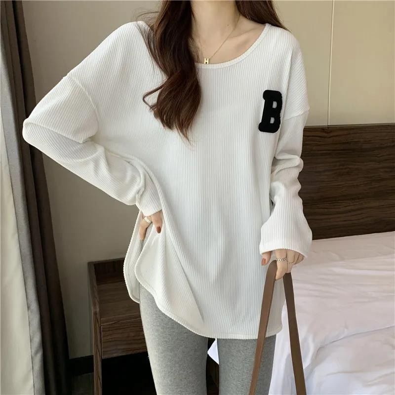 Главная страница > Футболка с длинными рукавами женская 2022 Ранняя весна Новая буква Сплит Foreign Air Свободная рубашка среднего и длинного низа Женская