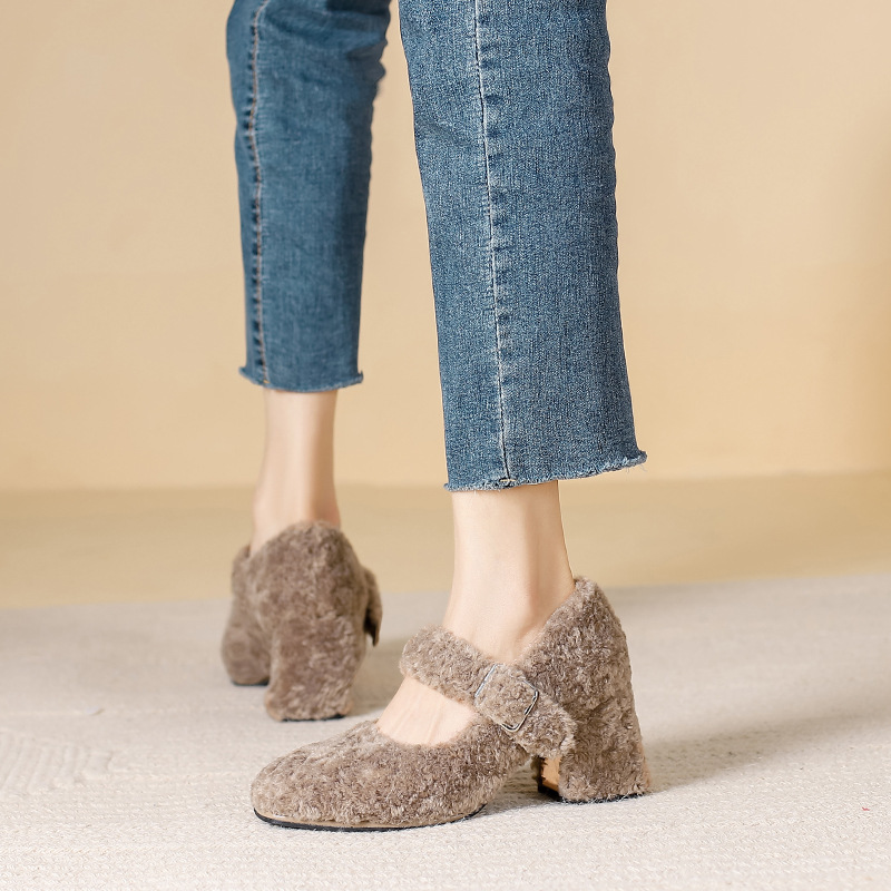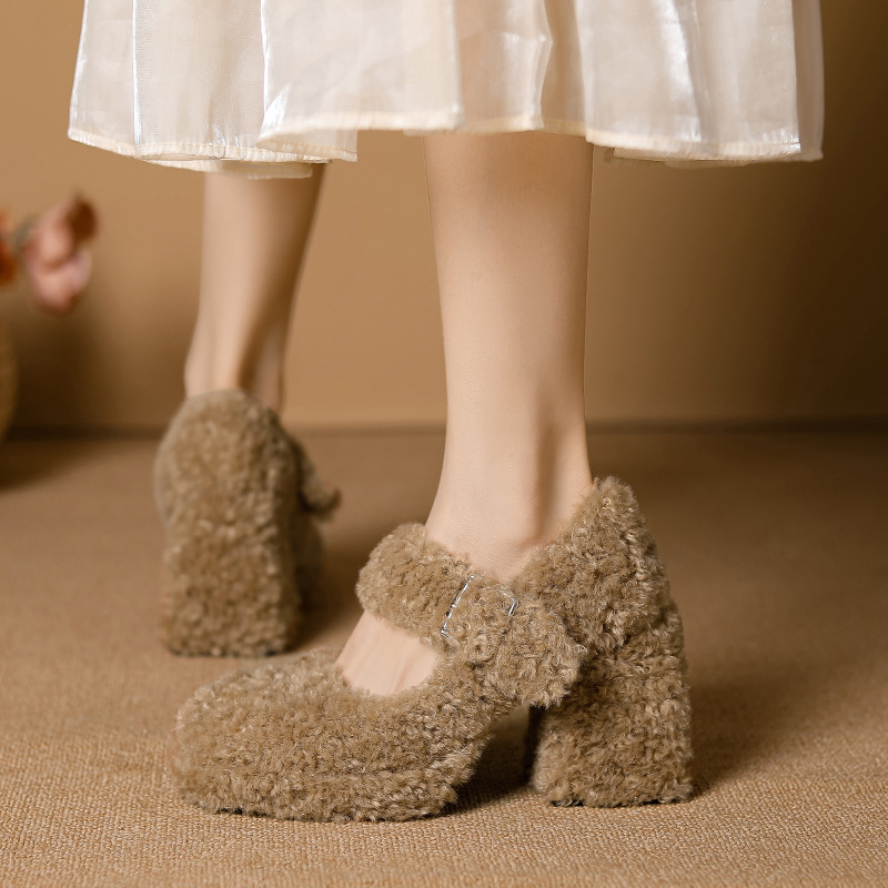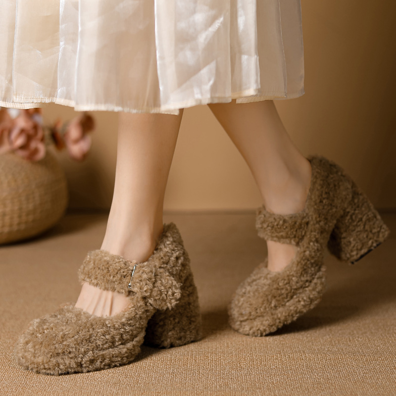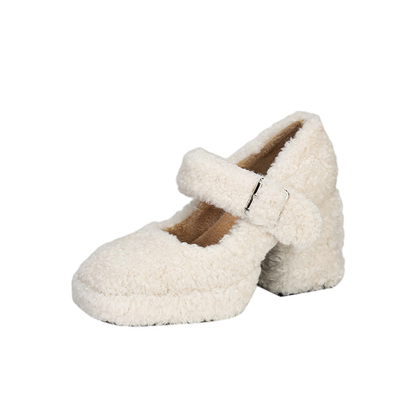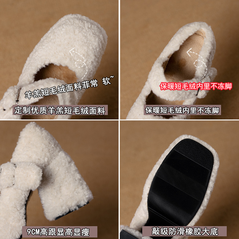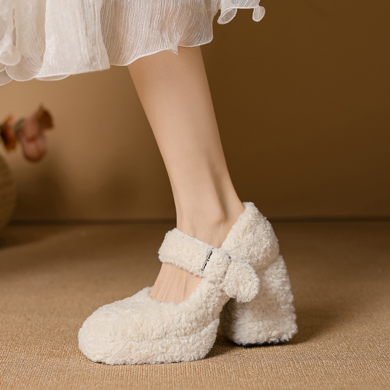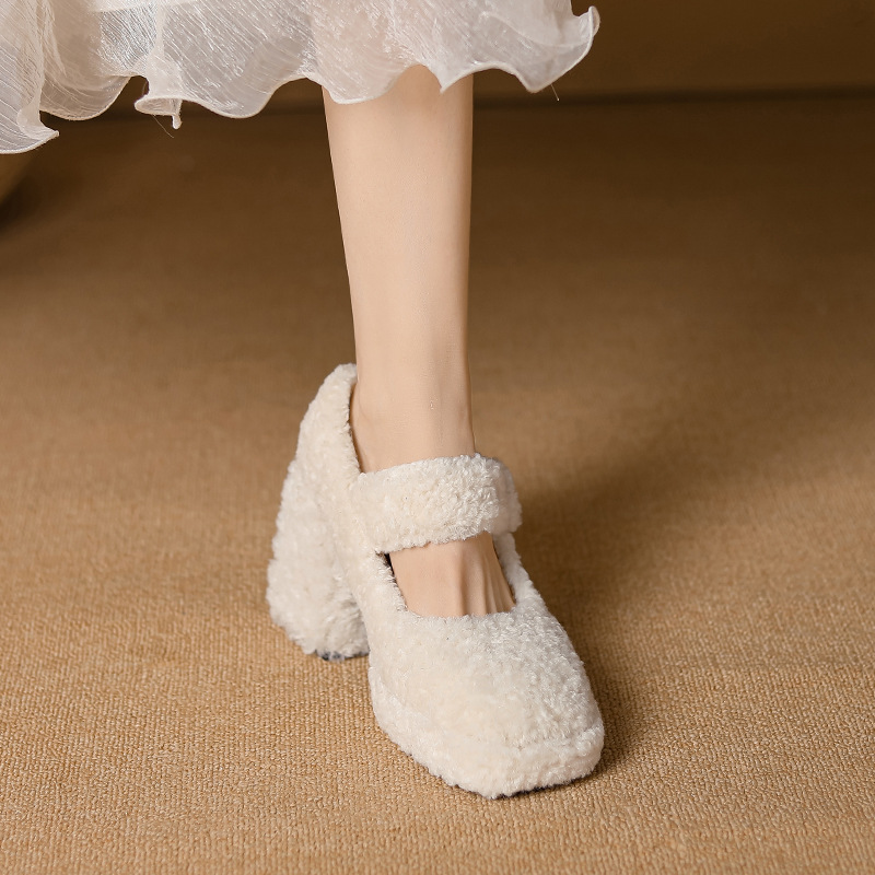 Главная страница > (Спот) Продвинутые белые толстые подошвы на высоких каблуках толстые каблуки зимние бархатные французские туфли Мэри Джейн