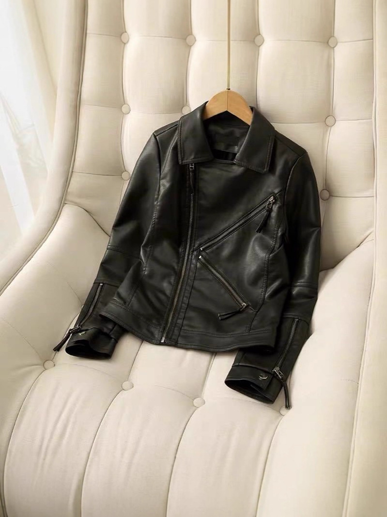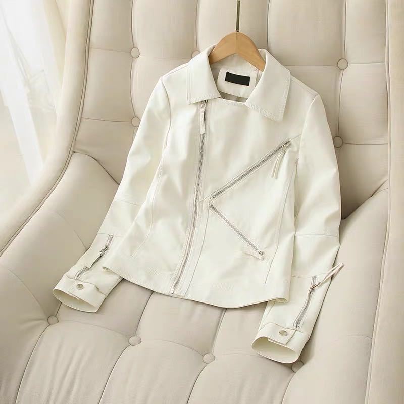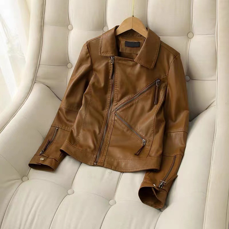 Главная страница > Женская кожаная куртка 2023 года, весна-осень, корейский стиль, укороченная, приталенная, в стиле байкерской куртки, с эффектом стройности, в гонконгском и европейско-американском стиле.