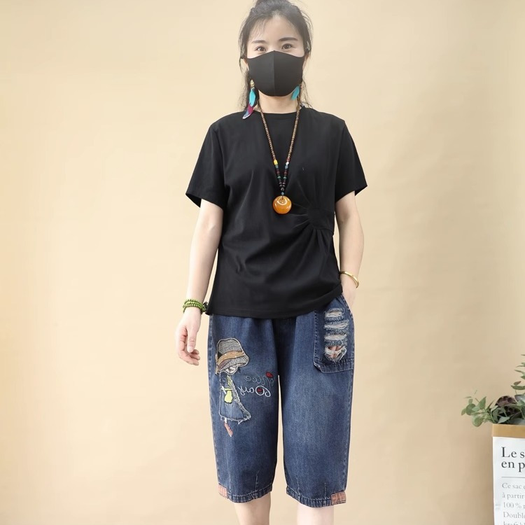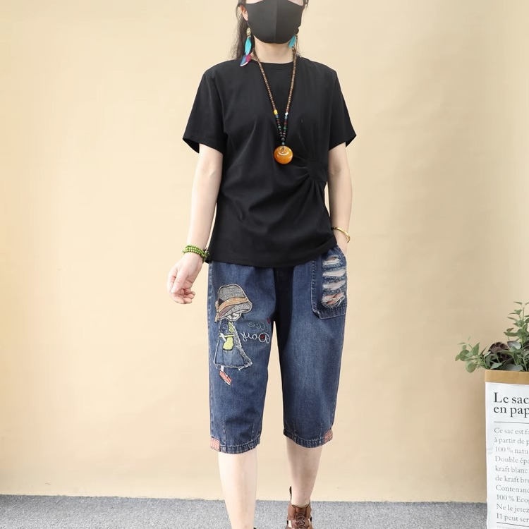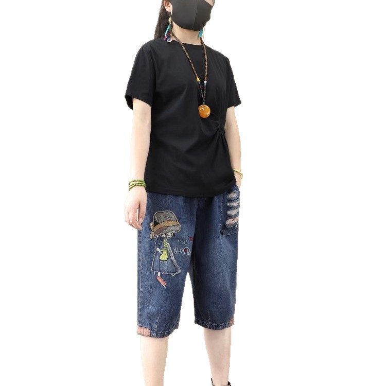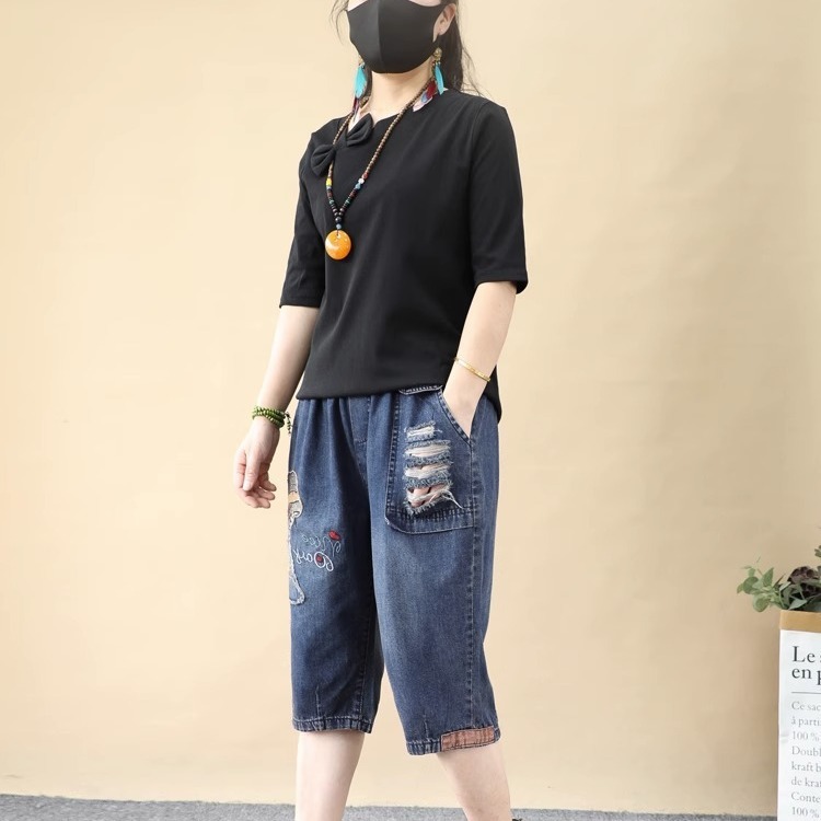 Главная страница > Летние ультратонкие укороченные джинсы для женщин, брюки с нашивками в стиле ретро для девочек, женские свободные рваные шаровары выше колена.