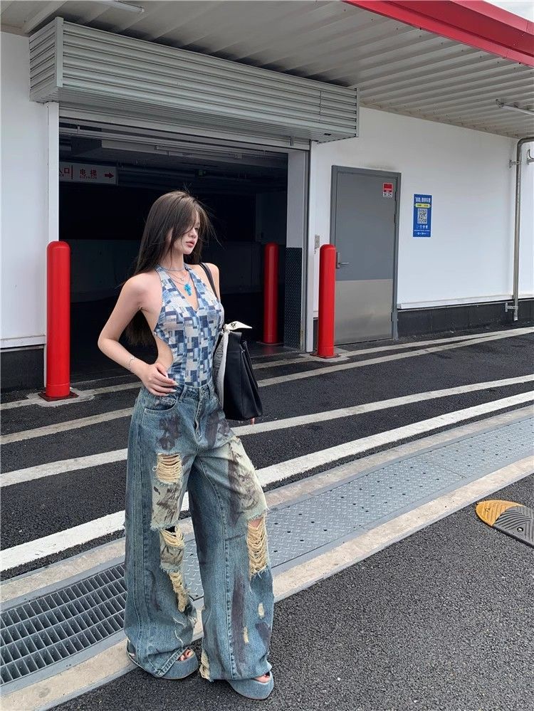 Главная страница > Дизайнерские рваные широкие джинсы в американском стиле для женщин, лето 2025, с высокой талией, большие размеры, свободные брюки-бродяги