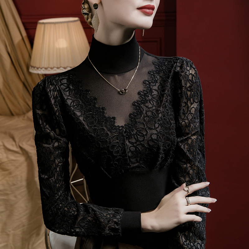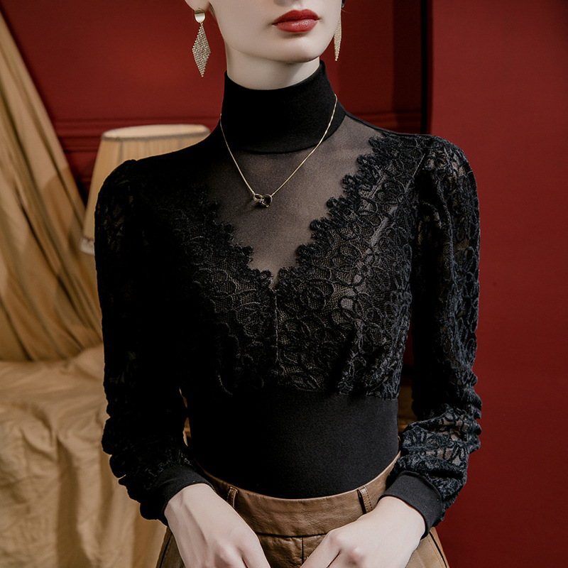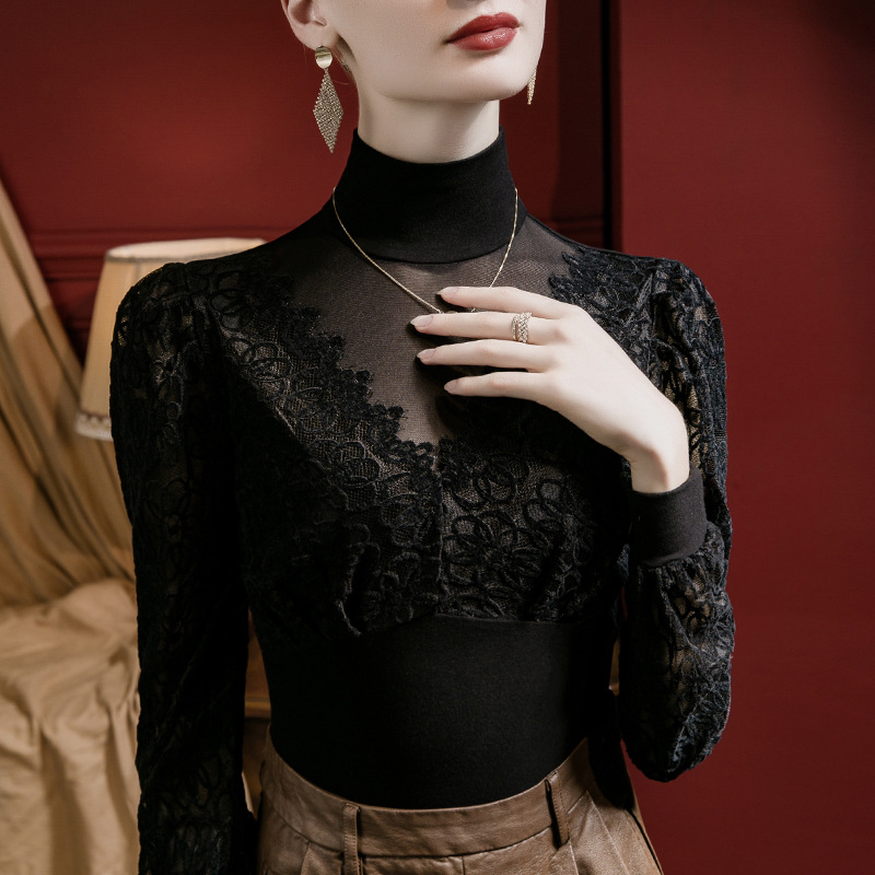 Главная страница > Шея сетчатая строчка кружевная рубашка Женская 2023 Осень Новый рукав лампа иностранный Темперамент осенне-зимняя Нижняя куртка