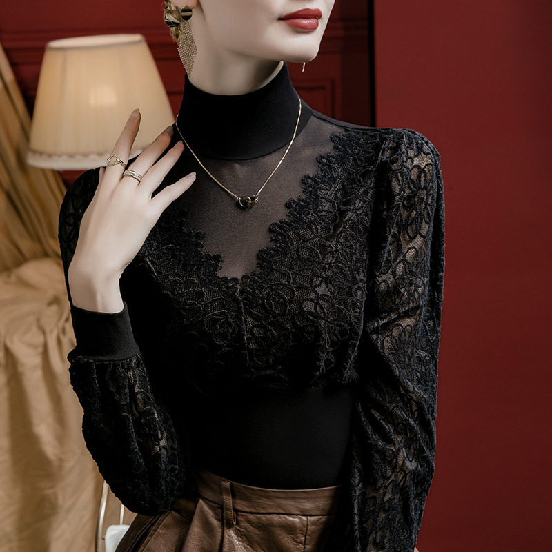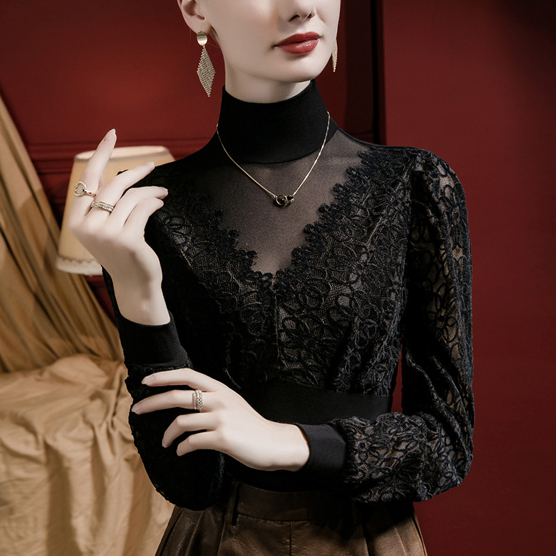Шея сетчатая строчка кружевная рубашка Женская 2023 Осень Новый рукав лампа иностранный Темперамент осенне-зимняя Нижняя куртка