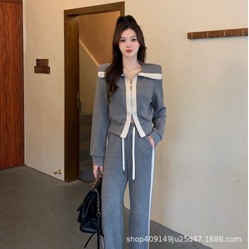 Главная страница > Европейский серый повседневный спортивный костюм, женский осенний свитер в западном стиле, свитер с кукольным воротником с высокой талией, прямые брюки, комплект из двух предметов