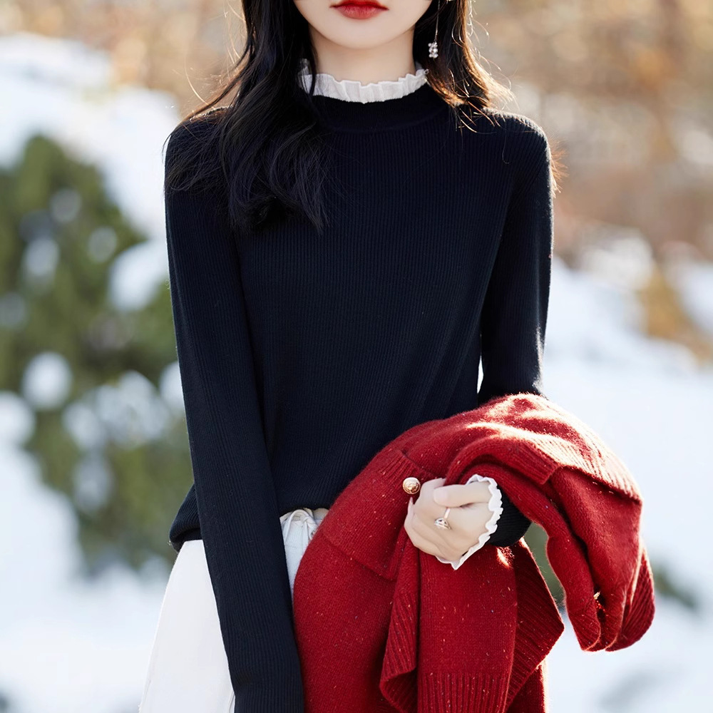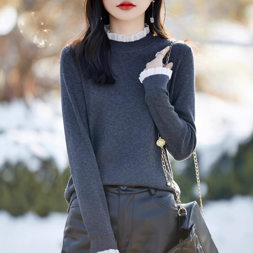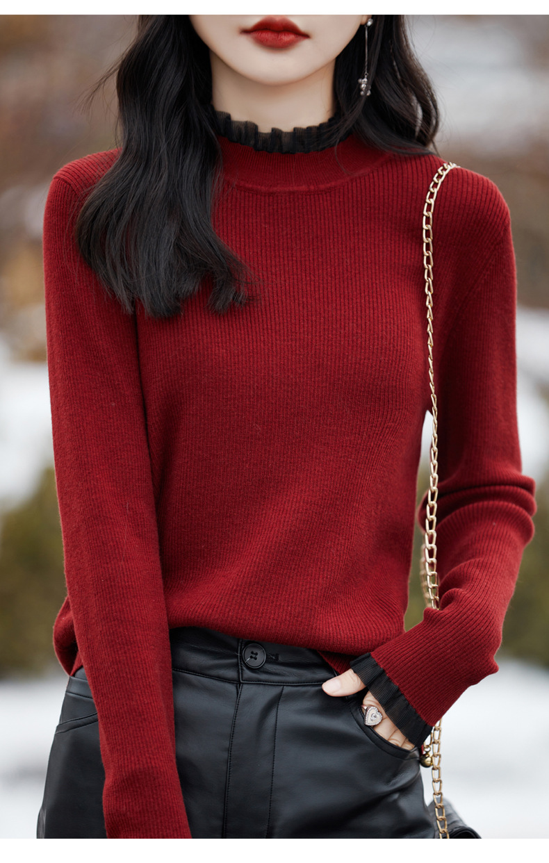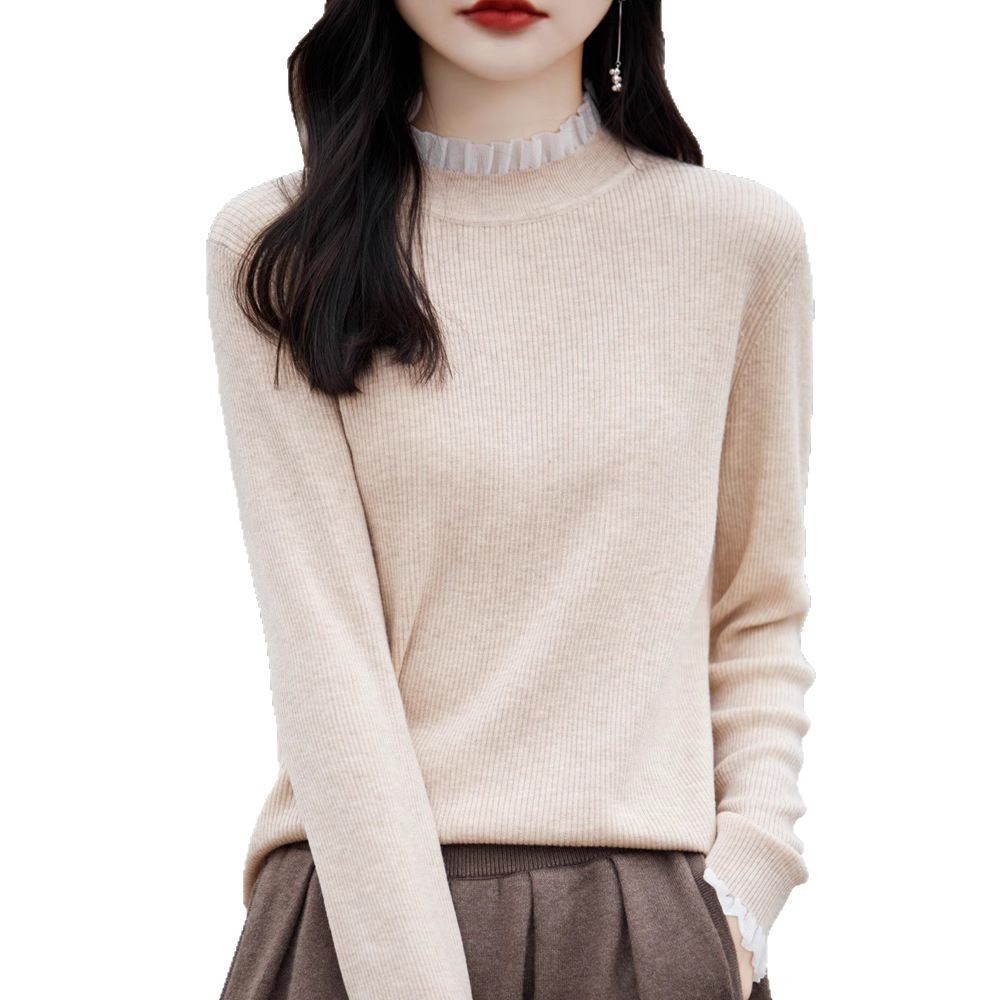 Весенний стиль 2025 новый деревянный кружевной трикотаж женский пол-высокий воротник сплошной цвет тонкий пуловер свитер нижняя рубашка женский