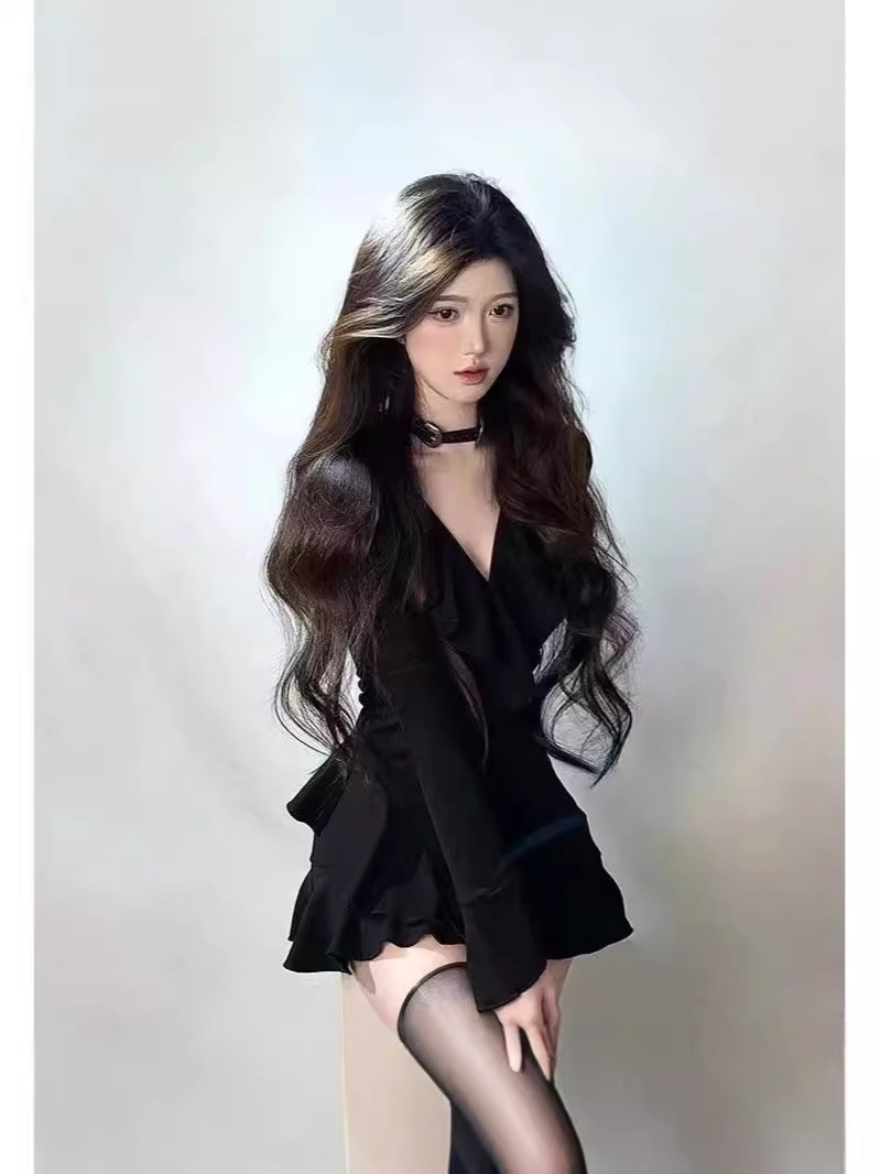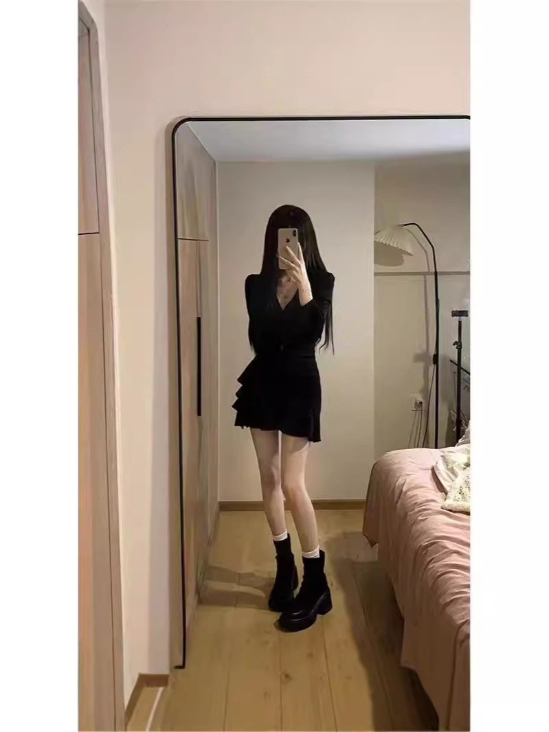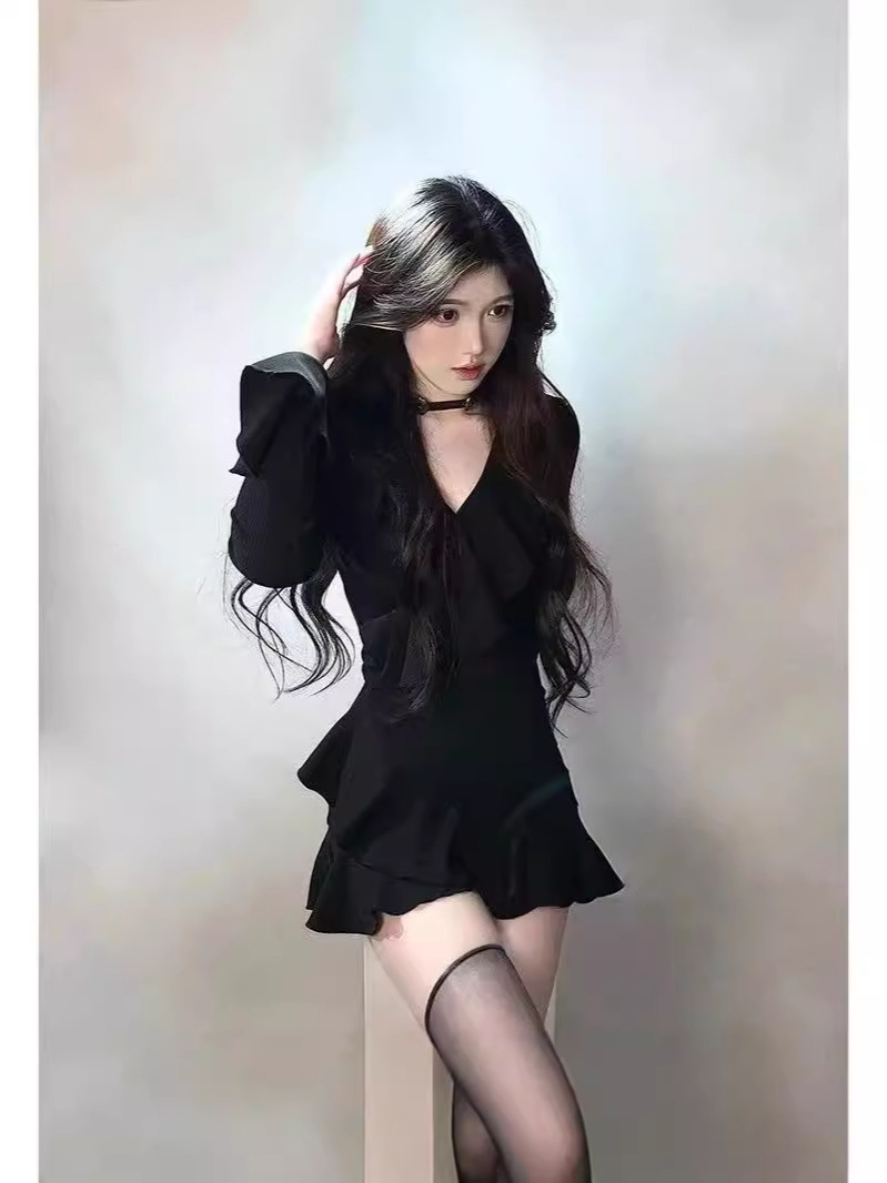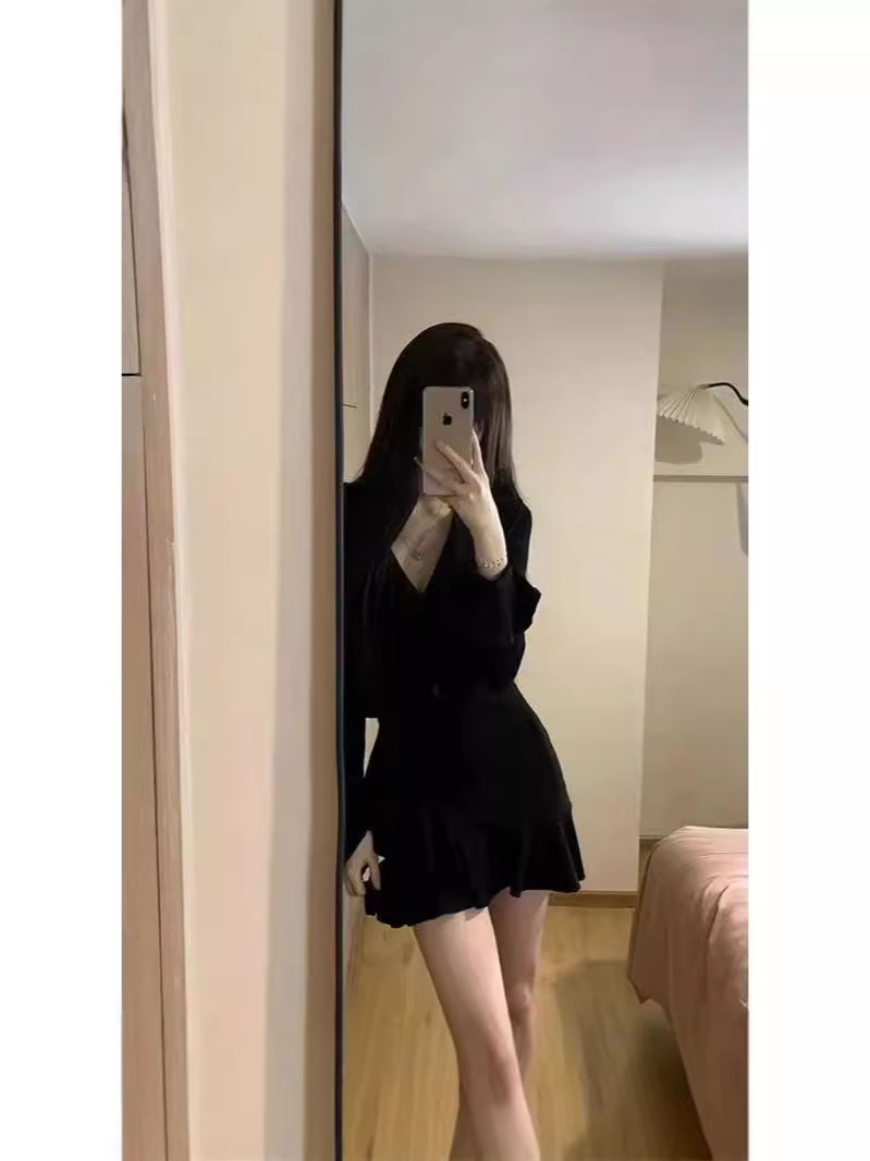 Главная страница > Черная расклешенный рукав с длинным рукавом платье с v-образным вырезом женское осенний и зимний темперамент маленькая черная юбка с талией