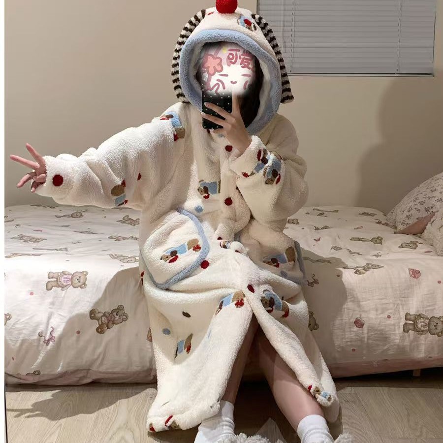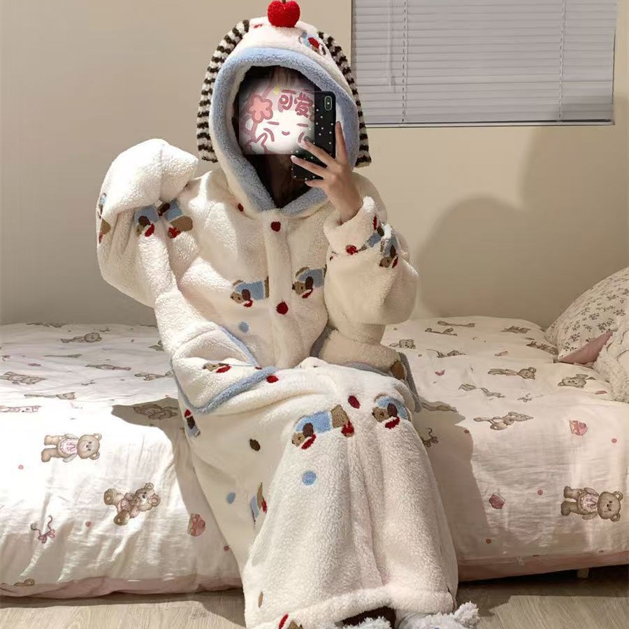 [Колбаса щенок] Коралловый бархат с капюшоном женский зимний толстый теплый фланелевый набор домашней одежды