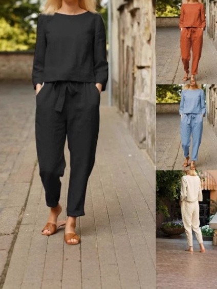 Главная страница > Льняный костюм женская мода сплошной цвет повседневный набор из двух частей внешней торговли весна и лето простой ретро эластичный пояс