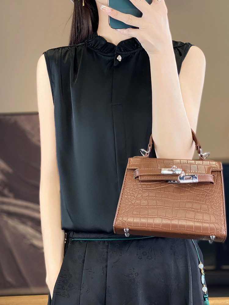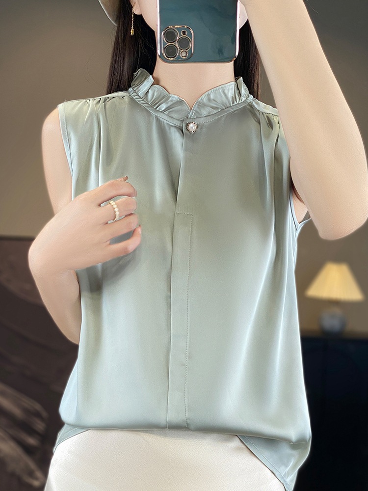 Грибок воротник без рукавов сплошной цвет жилет с пряжкой шелковистая атласная поездка тонкая весна и лето тонкая темпераментная рубашка женщина