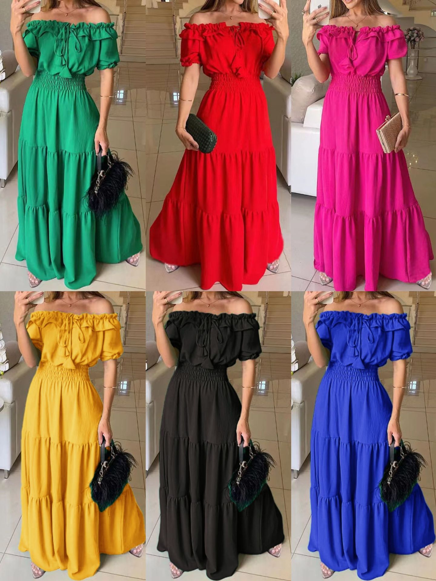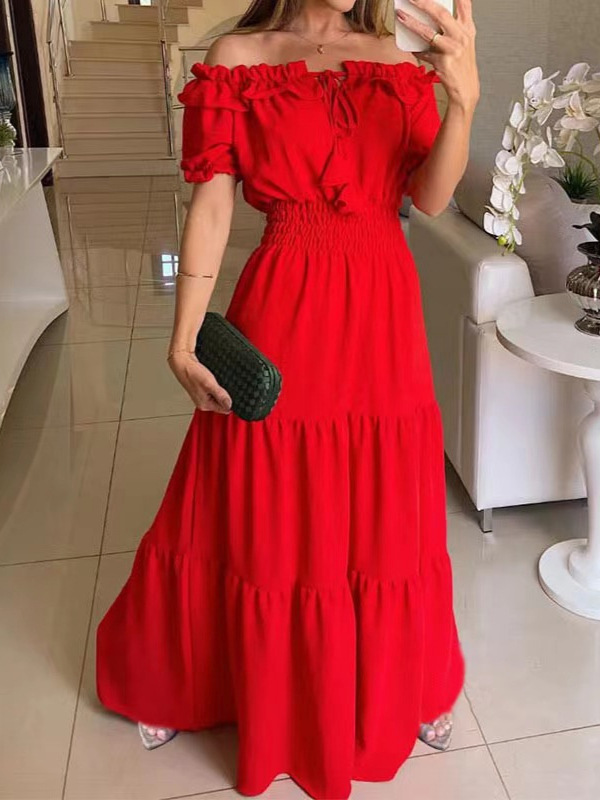 Главная страница > 2025 европейское и американское трансграничное экспортное новое модное однотонное платье с лотосом на шнуровке и краем в виде листьев, топ с пышными рукавами и большим подолом
