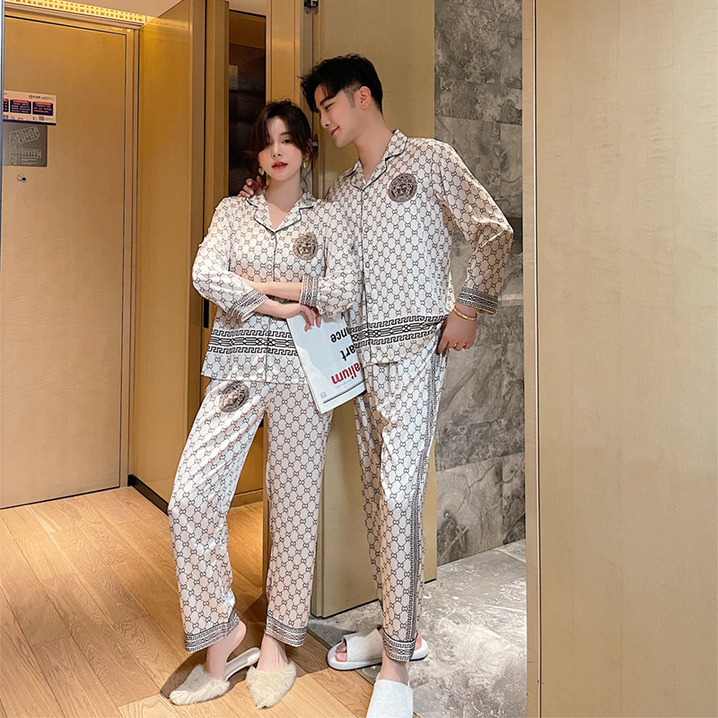 Пижамы для пар, Женская осенне-зимняя одежда из ледяного шелка, новый кардиган с лацканами, клетчатый Шелковый костюм с длинными рукавами для весны и осени