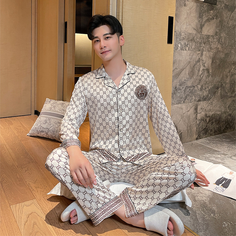 Главная страница > Пижамы для пар, Женская осенне-зимняя одежда из ледяного шелка, новый кардиган с лацканами, клетчатый Шелковый костюм с длинными рукавами для весны и осени
