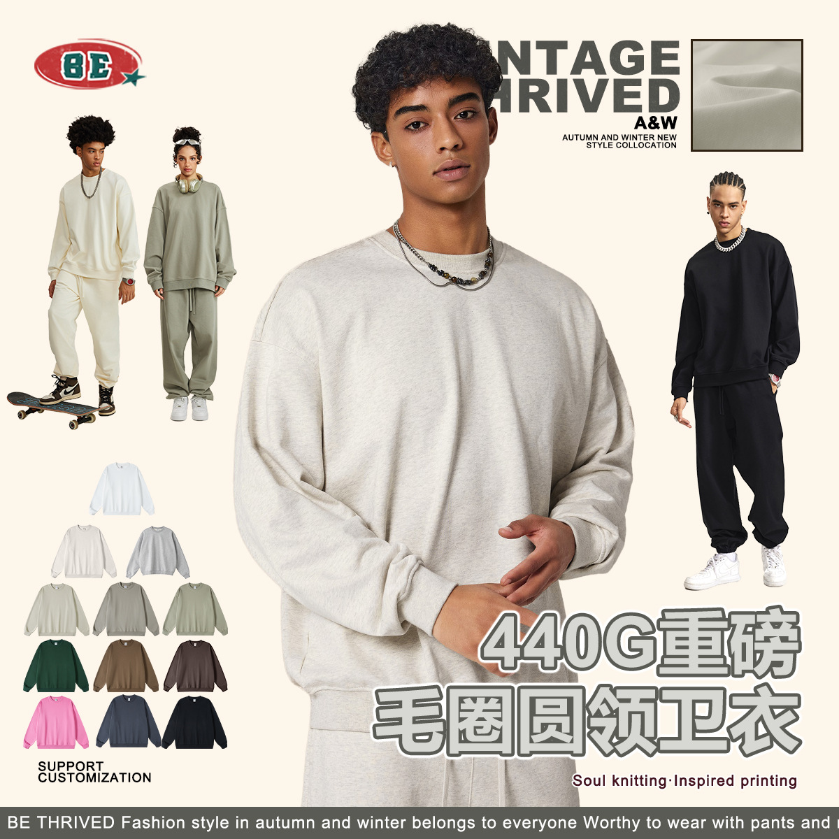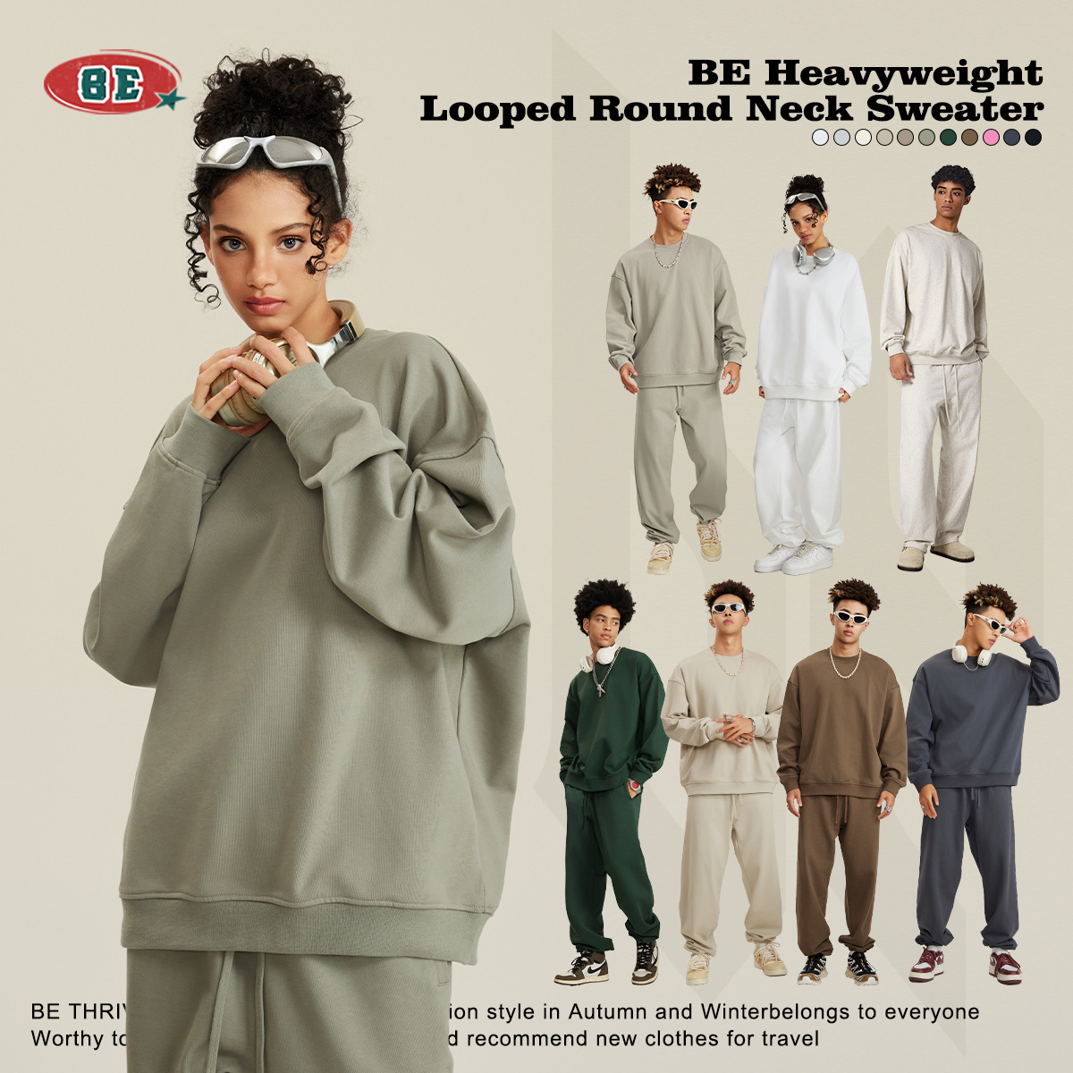 Главная страница > BE Men 2025 весна и осень новый американский прилив сплошной цвет тяжелые махровых 440G свободный круглый воротник свитер мужской
