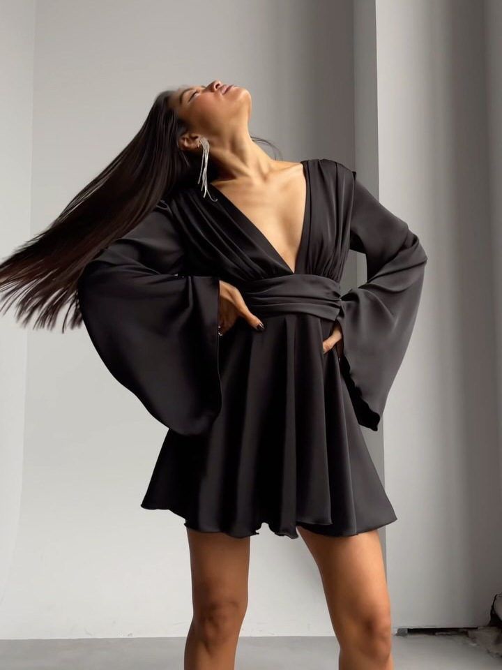 Главная страница > Европейские и американские трансграничные вечеринки Французские атласные расклешенные рукава сплошные платья с длинными рукавами для женщин Сексуальное платье с V-образным вырезом