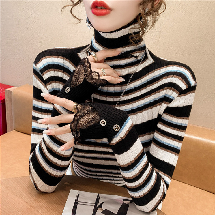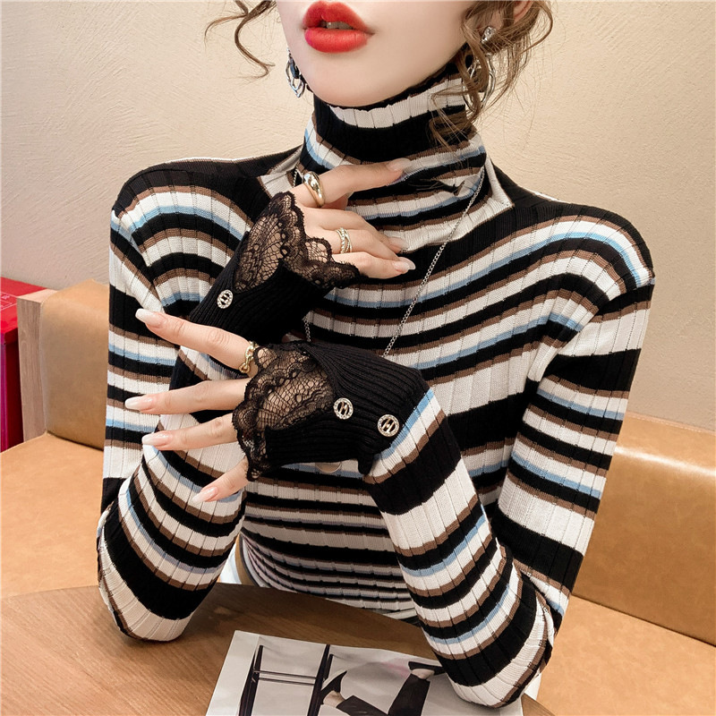 Водолазка, полосатый свитер, трикотажная нижняя рубашка, Женская внутренняя одежда, осенне-зимний шикарный топ в западном стиле с кружевной строчкой и длинными рукавами
