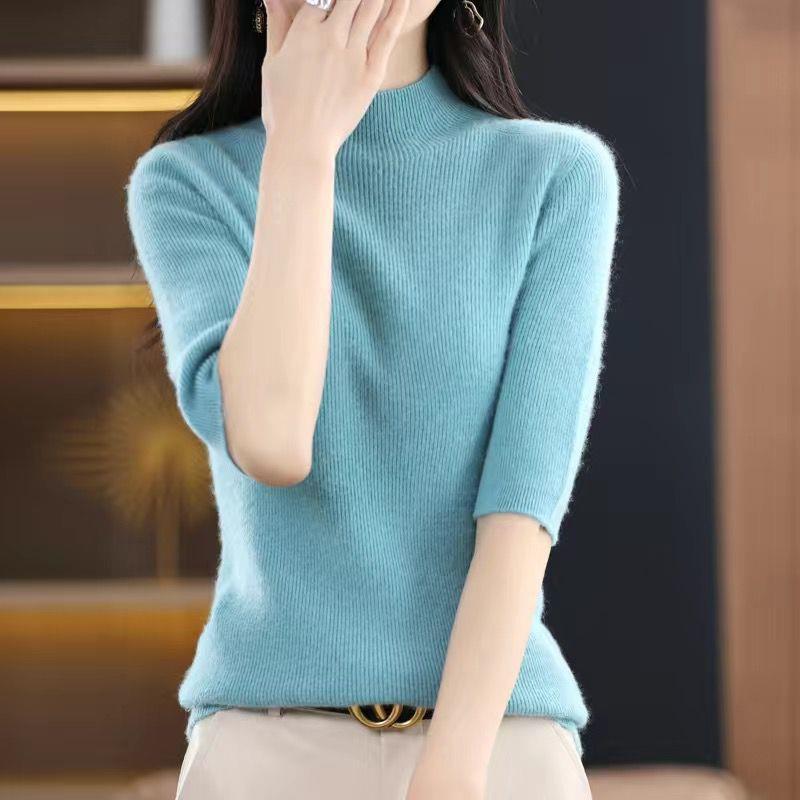 Модный женский базовый слой с рукавами три четверти, весенне-осенний свитер со средним рукавом, полувысоким воротником, облегающий крой, элитный трикотажный свитер с короткими рукавами и половиной рукавов.
