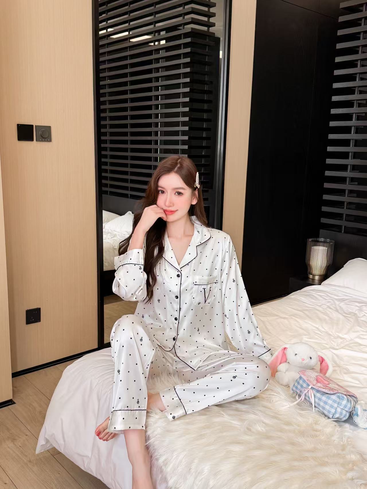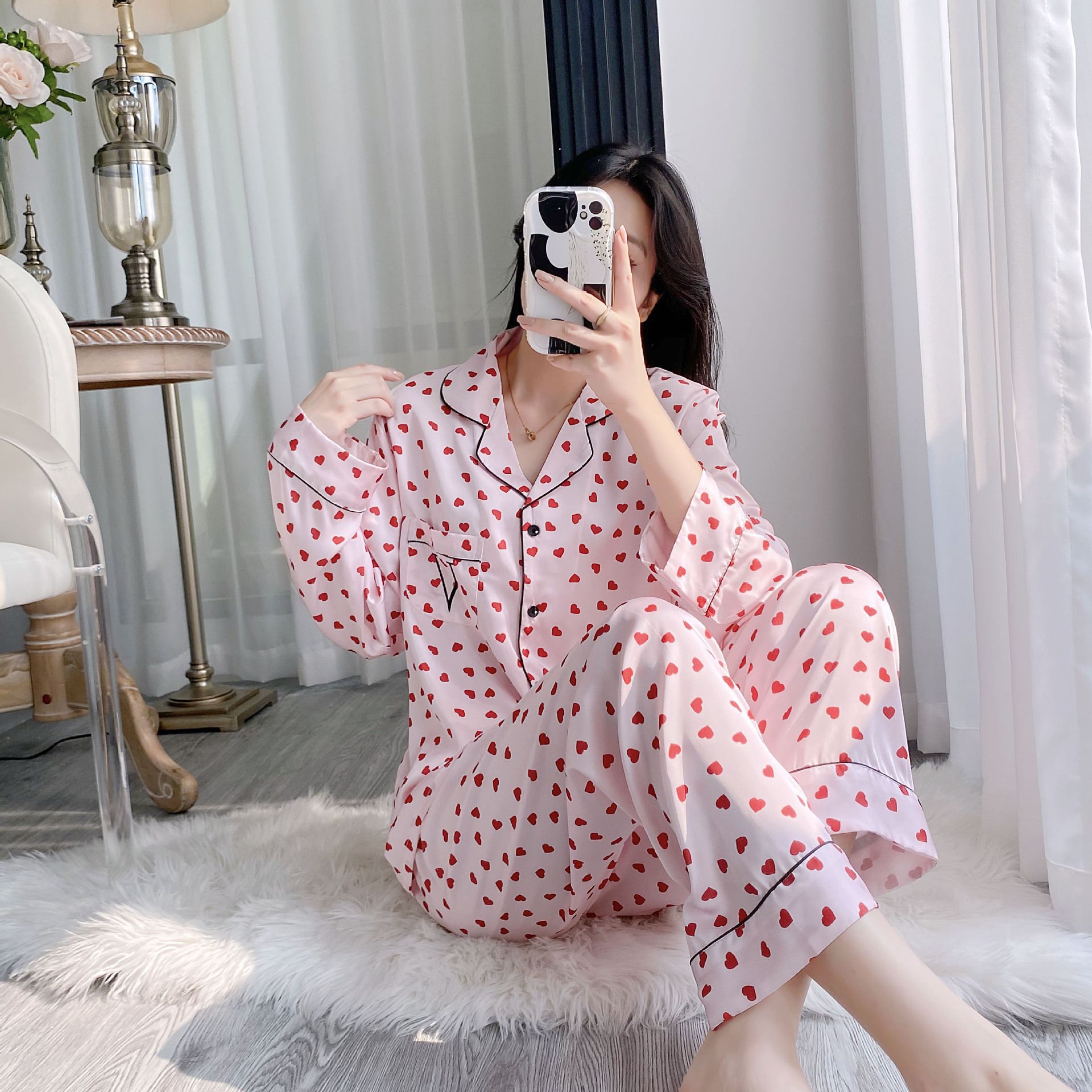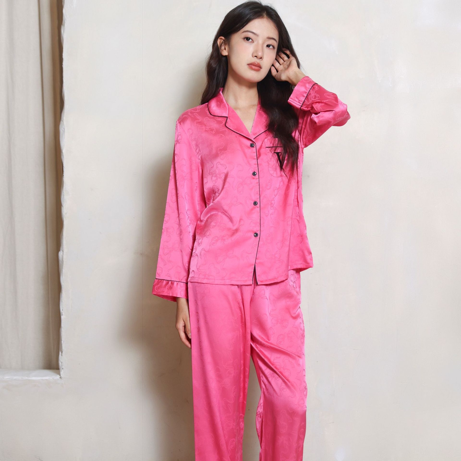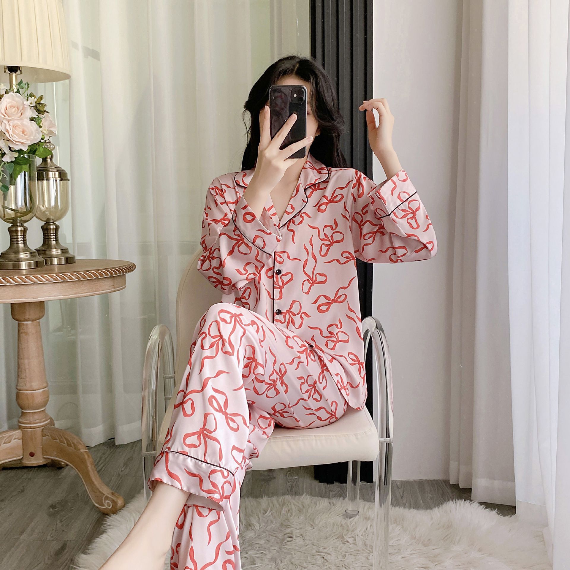Светло-розовая лента против водяного шелка из ледяного шелка пижамы женская весна и осень продвинутые чувства с длинными рукавами
