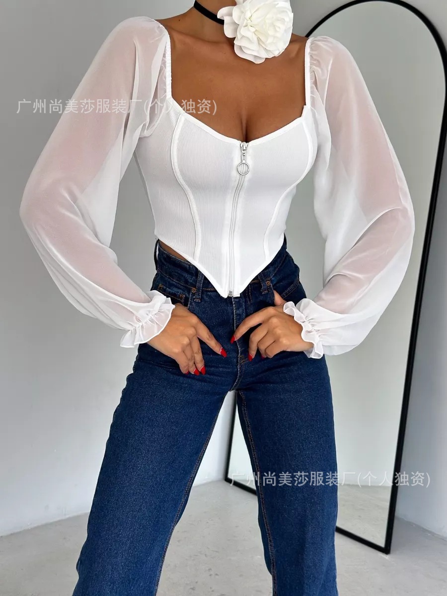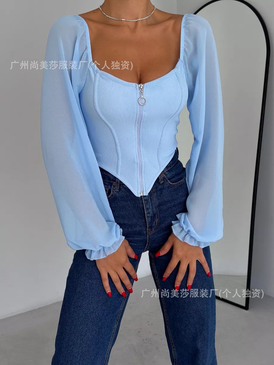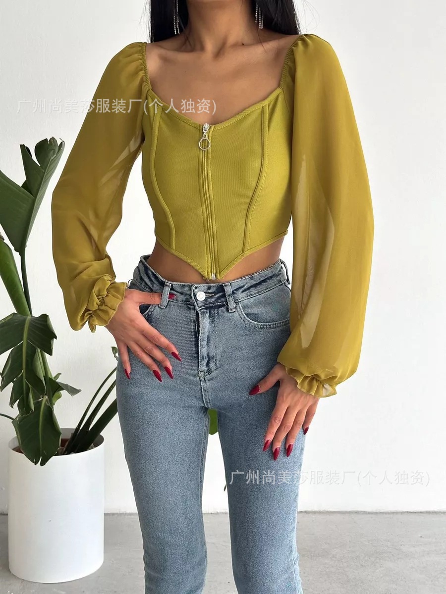 Главная страница > 2025 Трансграничный Европа Новый низкий V-образный вырез шифоновый рукав тонкая модная сексуальная рубашка кардиган топ женский