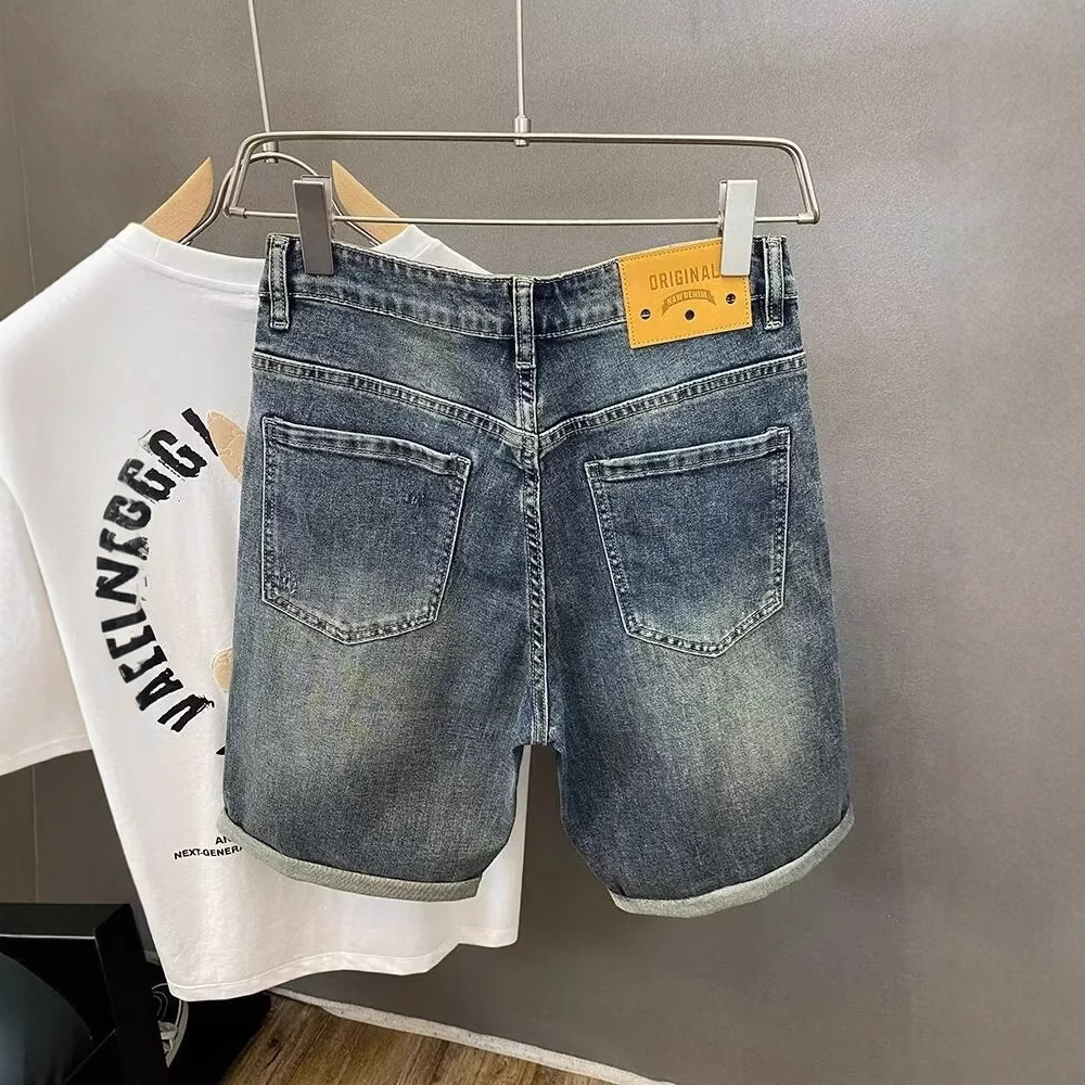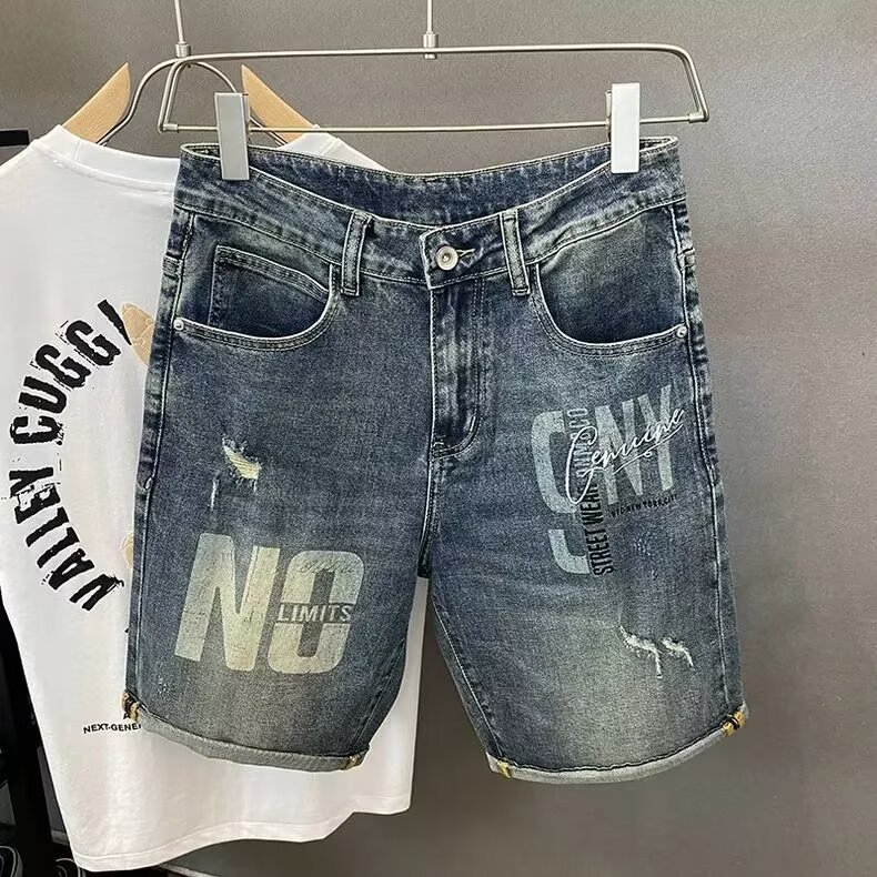 Мужские джинсовые шорты в европейском стиле, летние модные брендовые шорты до колена с вышивкой и принтом, модные тонкие повседневные эластичные шорты средней длины
