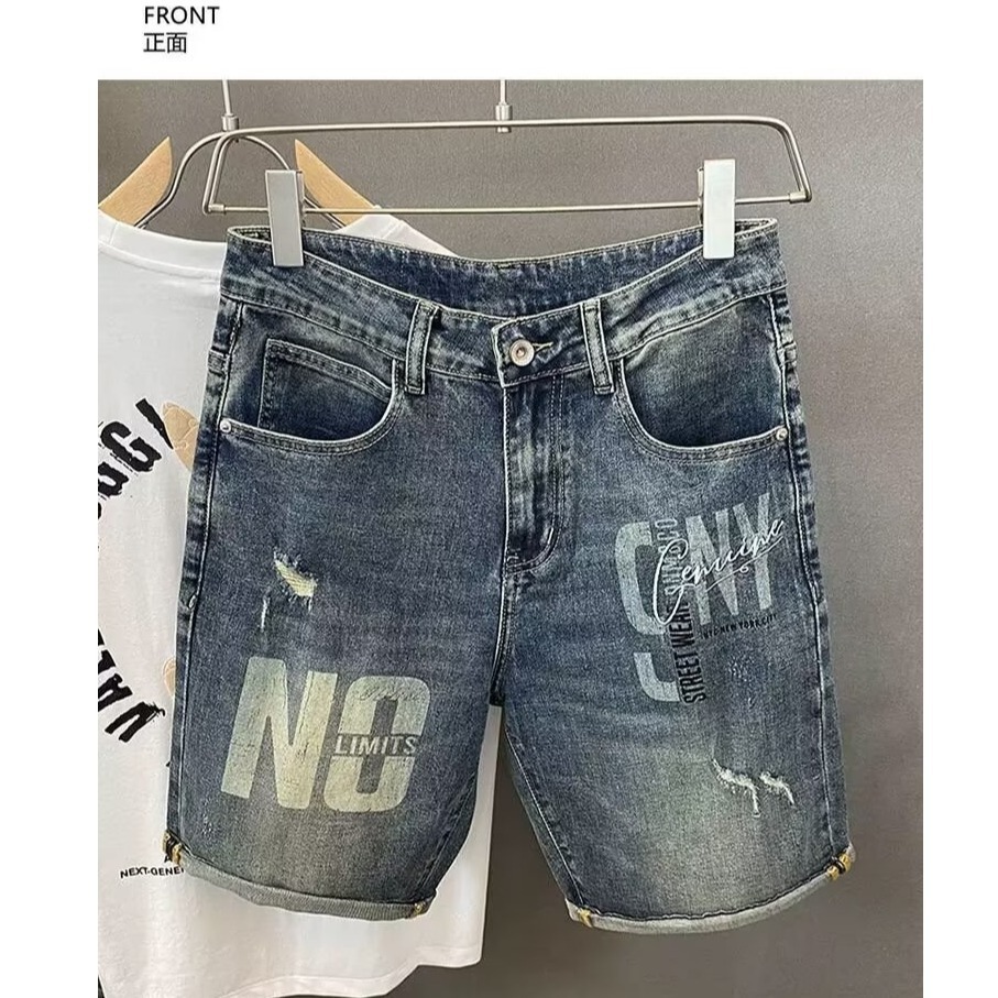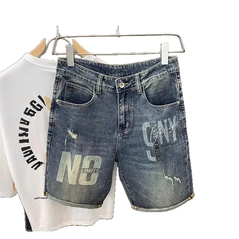 Главная страница > Мужские джинсовые шорты в европейском стиле, летние модные брендовые шорты до колена с вышивкой и принтом, модные тонкие повседневные эластичные шорты средней длины