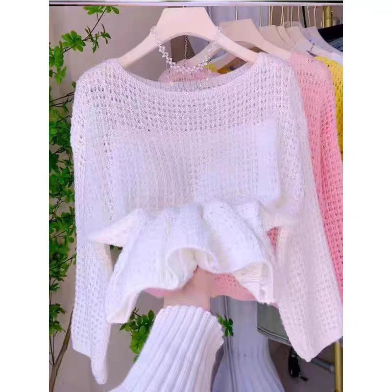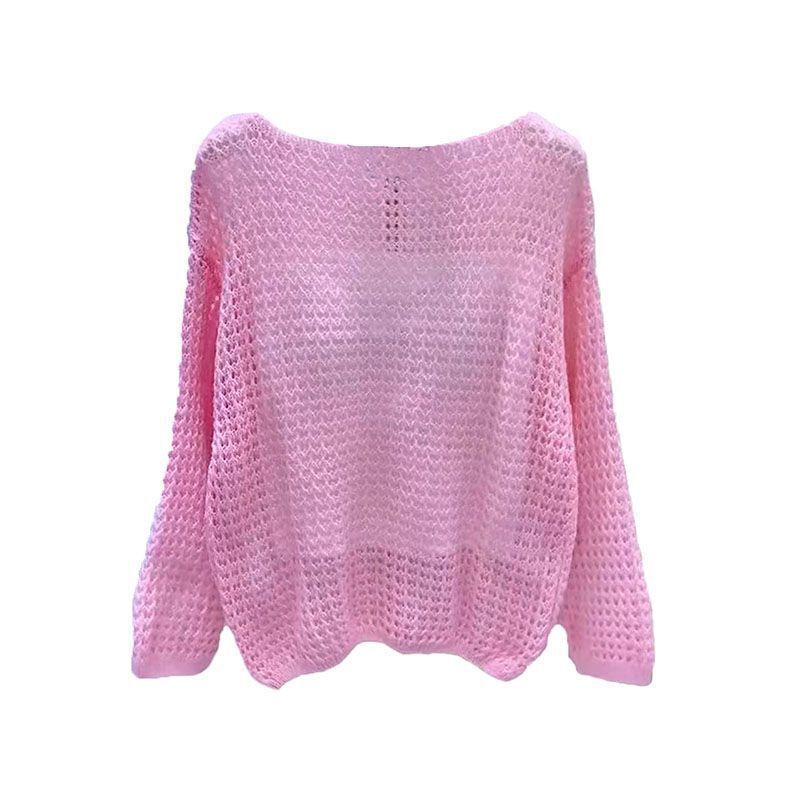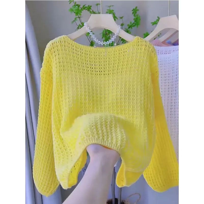 Главная страница > Тонкий и универсальный полый женский свитер, новый летний свободный ленивый стиль, верхняя одежда с длинными рукавами, модный однотонный топ