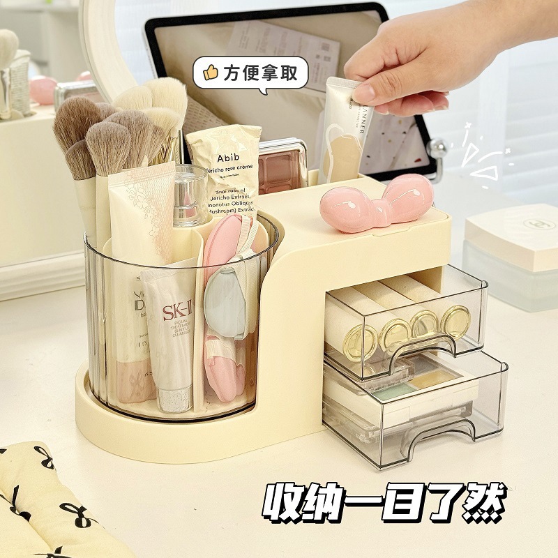 Кремовый настольный вращающийся ящик для хранения (с зеркалом для макияжа)