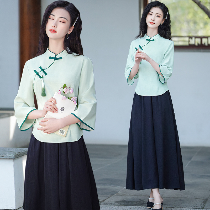 Групповая покупка нового женского костюма-чонсама из хлопка и льна в стиле ретро, пряжка с косыми лацканами, молодежная версия чайного костюма, комплект из двух предметов женского костюма Тан.
