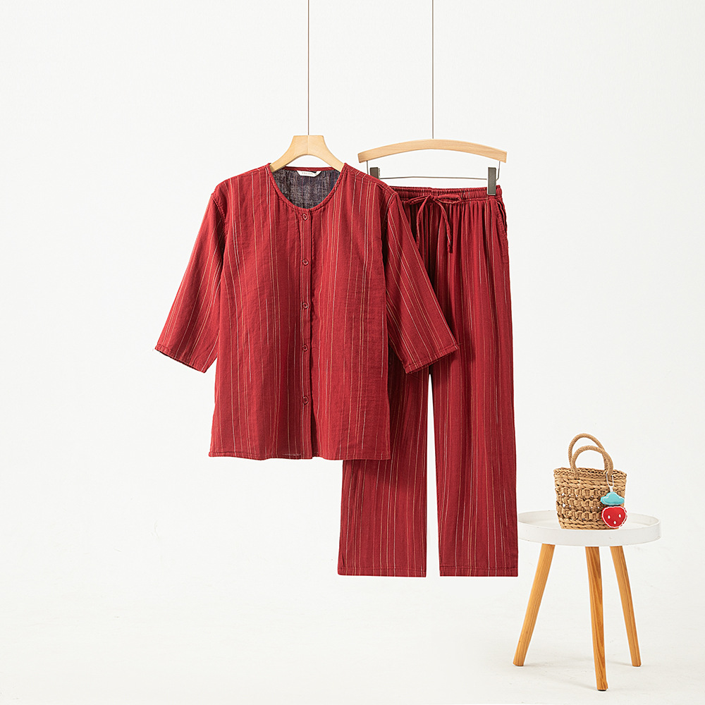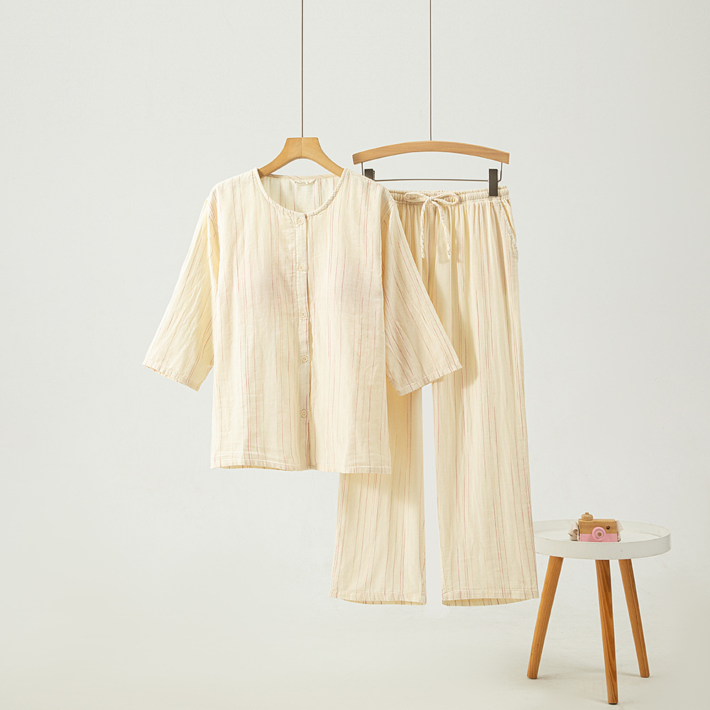 60-штучные весенне-летние пижамы из чистого хлопка из цветной двухслойной пряжи для женщин с подушечками для груди, костюмы с рукавами три четверти, домашняя одежда для пар из цветной пряжи
