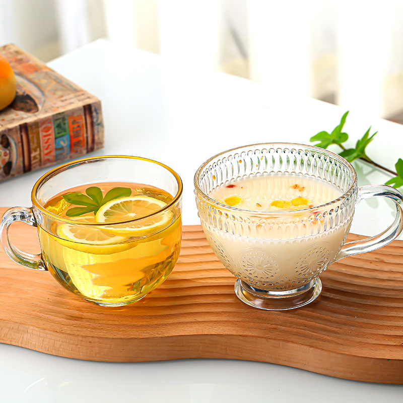 Главная страница > Винтажная тисненая чашка для молока подсолнечника Завтрак Бытовая стеклянная чашка для воды с ручкой Печатная овсяная чашка большой емкости