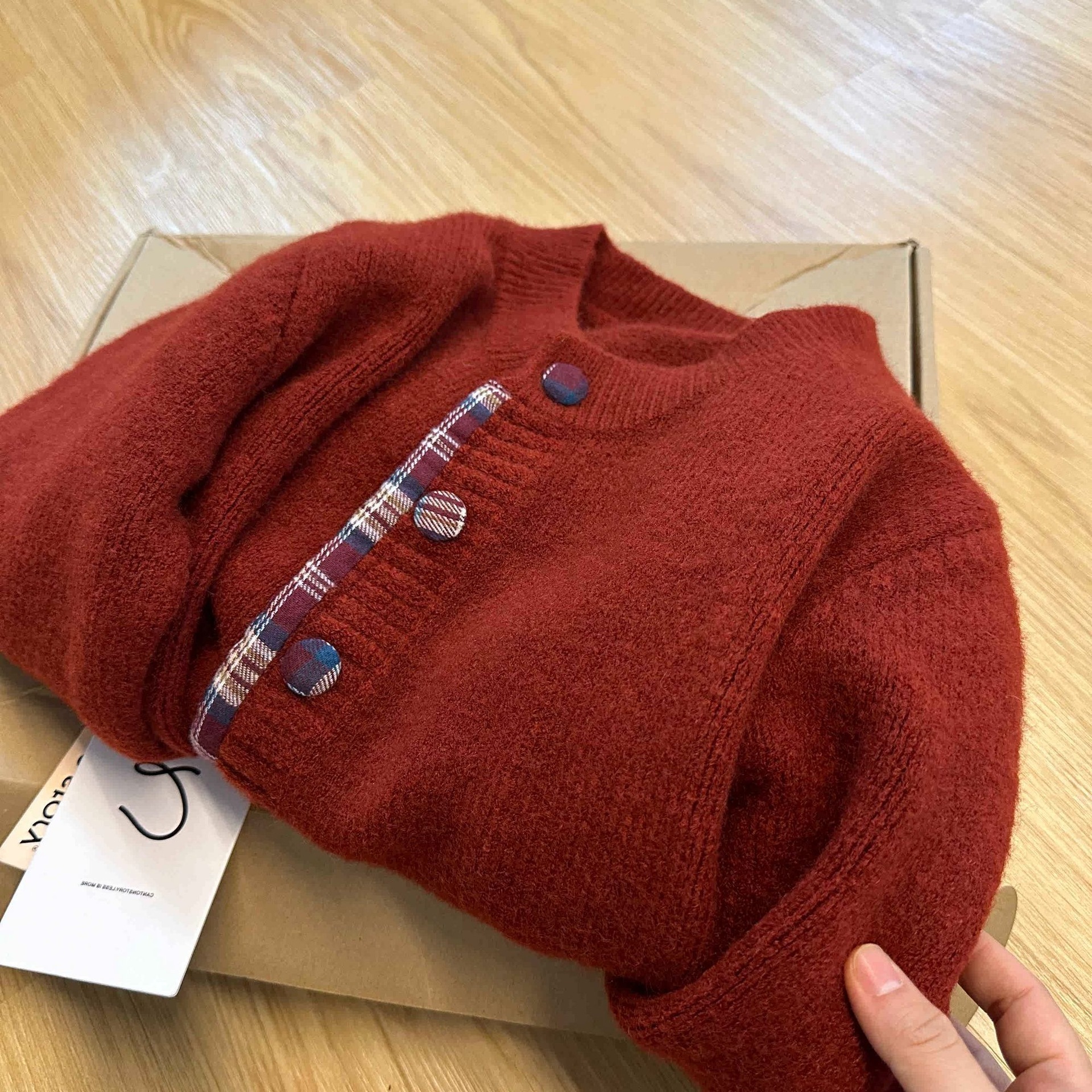 Поддельные две части корейского шитого шитого свитера в клетку 2024 пальто осень-зима новый трикотажный свободный повседневный кардиган