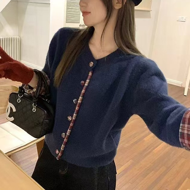 Главная страница > Поддельные две части корейского шитого шитого свитера в клетку 2024 пальто осень-зима новый трикотажный свободный повседневный кардиган