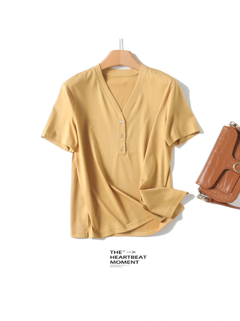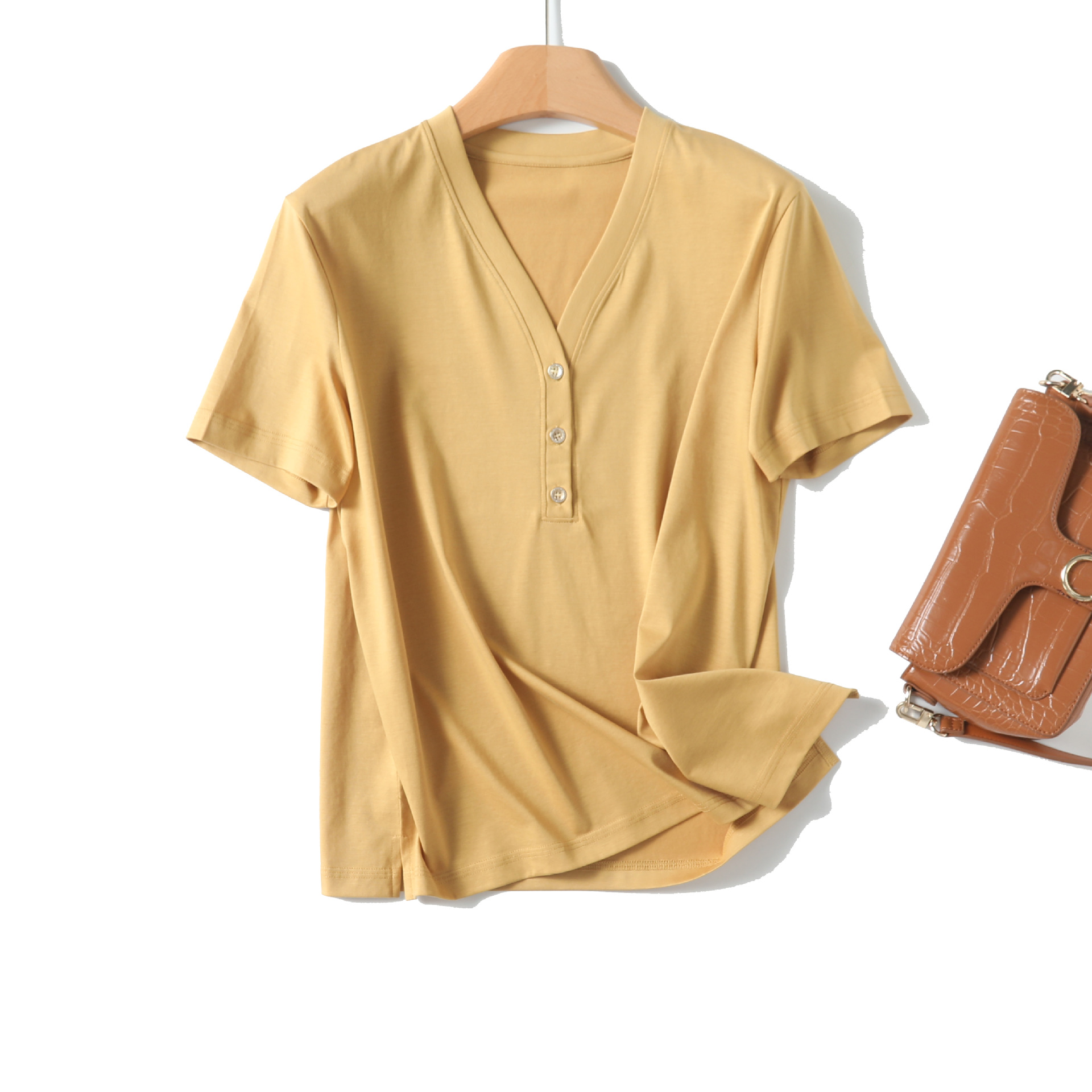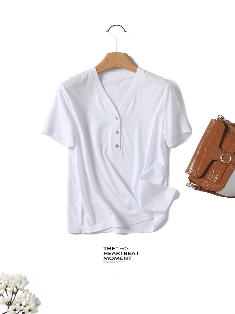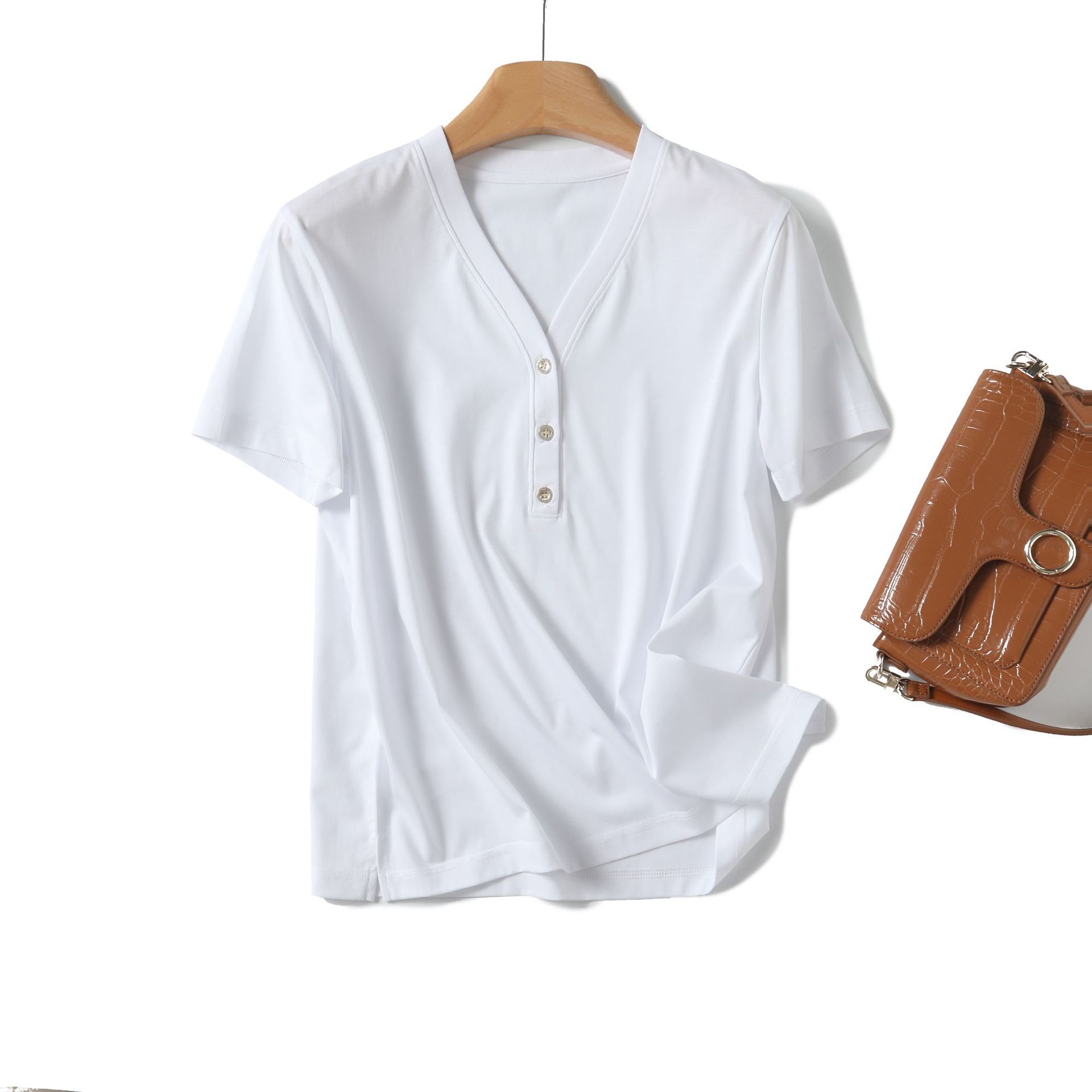 Главная страница > Женская футболка с короткими рукавами и топом из шелкового шелка для женщин, лето 2025, новый стиль, элегантная модная футболка с v-образным вырезом, однотонная фиолетовая футболка с короткими рукавами