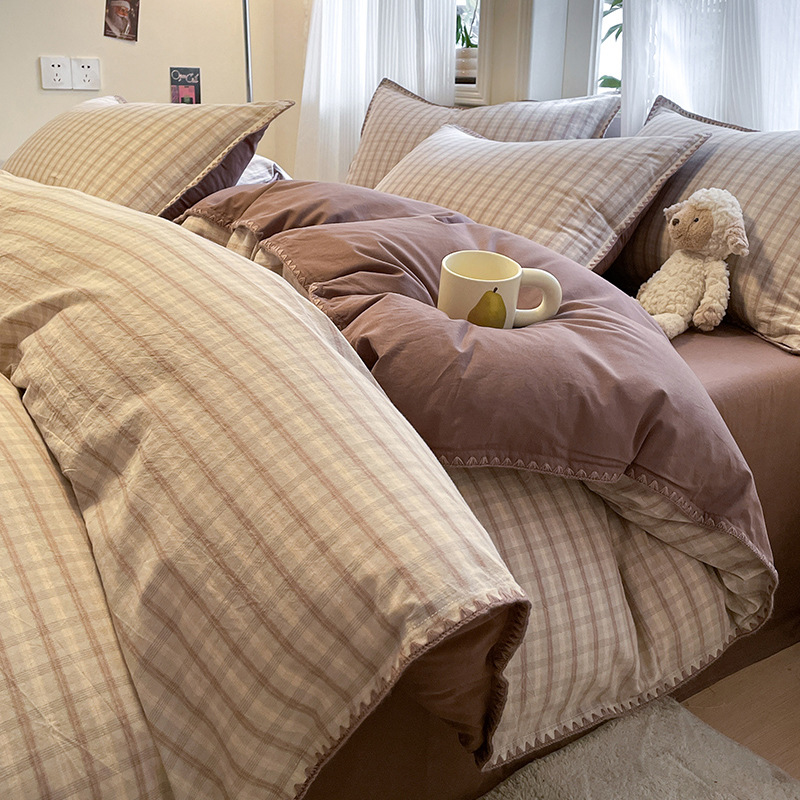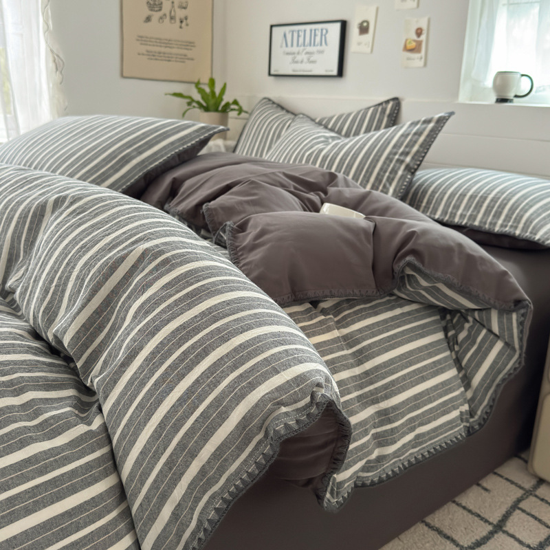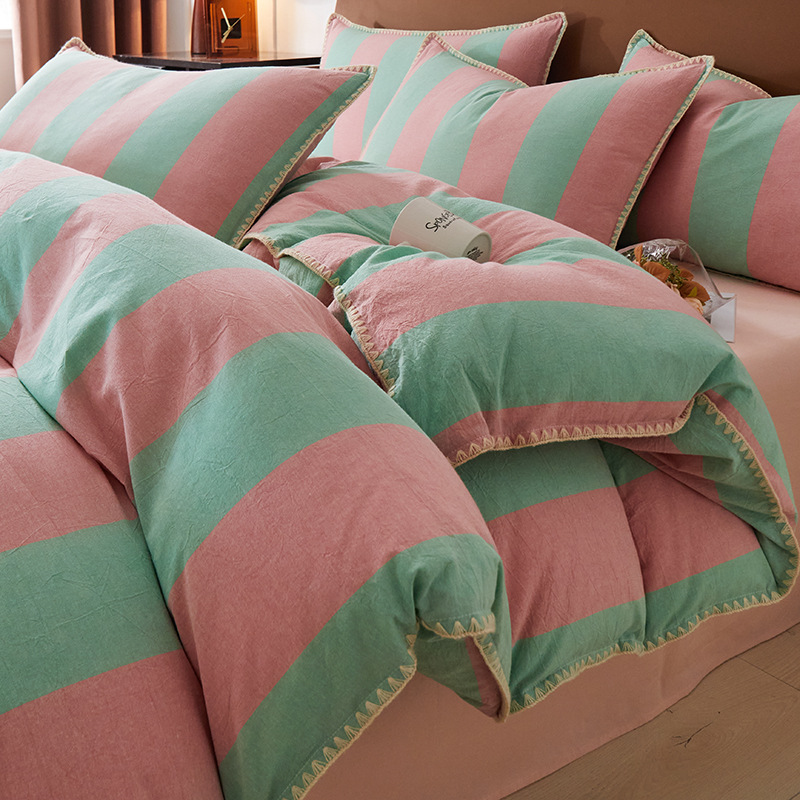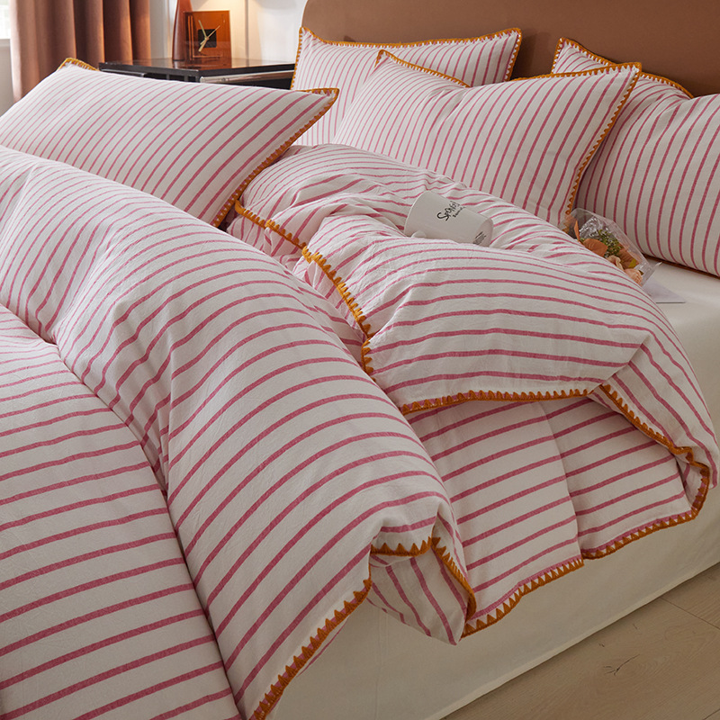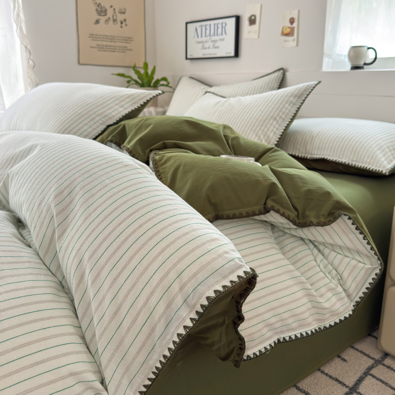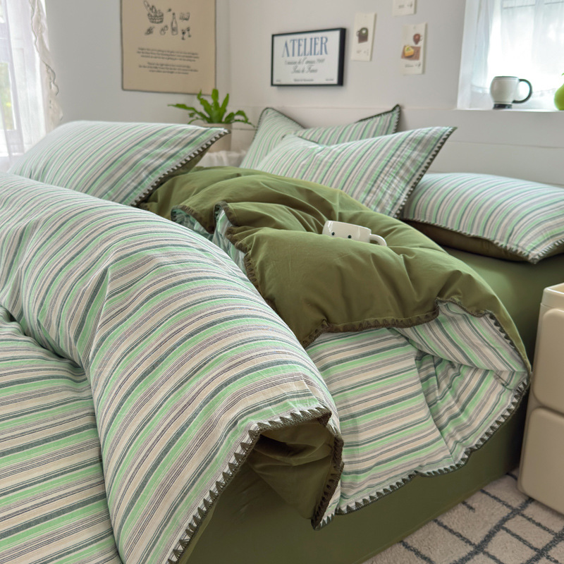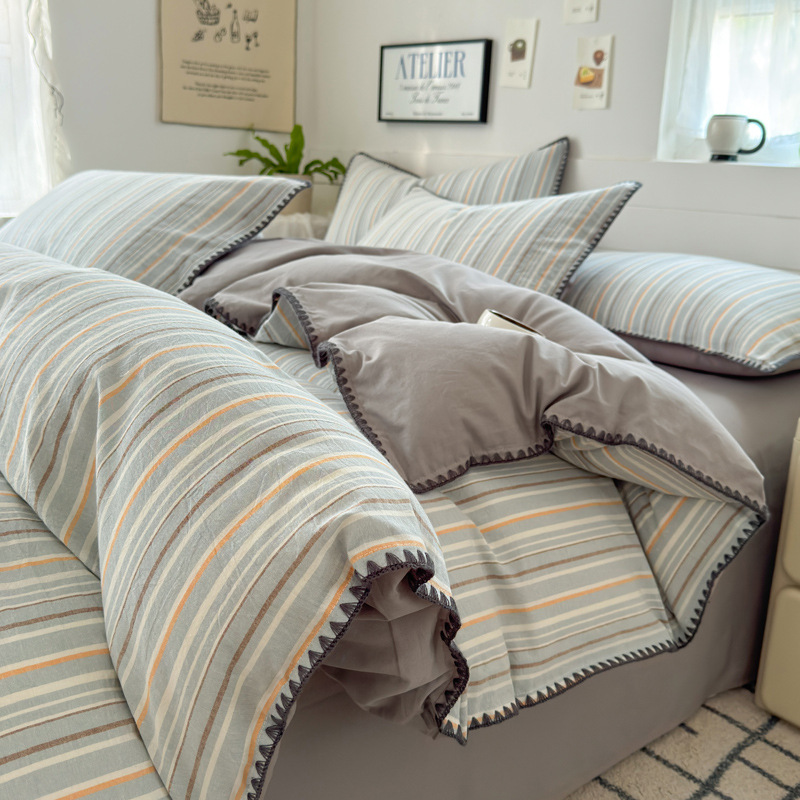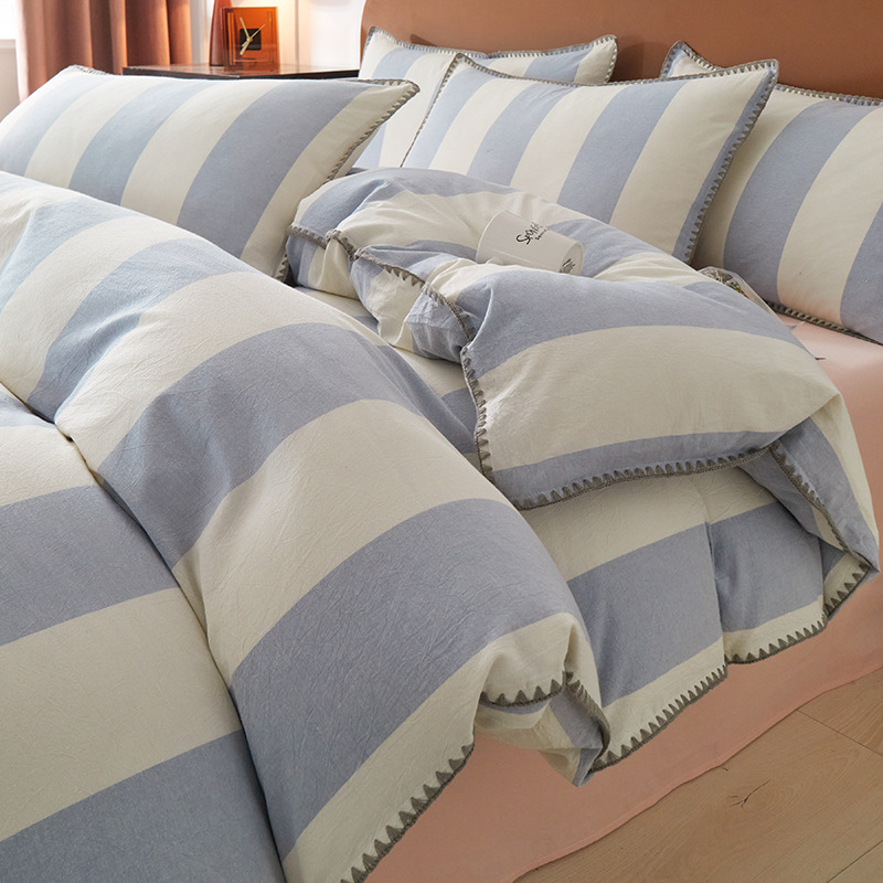 - Комплект из четырех предметов простыни длиной 1,5 м, пододеяльник, простыня 2,0*2,3 м, наволочка 2,4*2,5 м*2