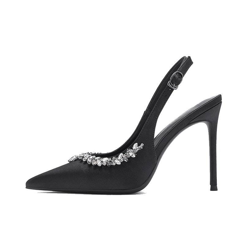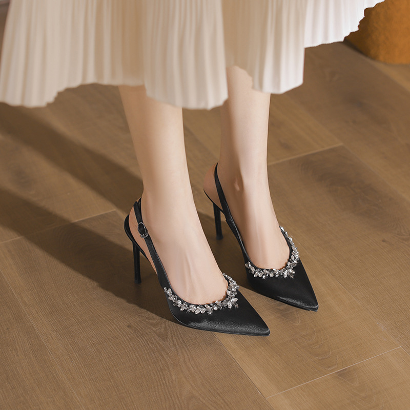 Главная страница > Женские летние туфли-лодочки на высоком каблуке-шпильке с французским стилем, стразами, заостренным носком, накладкой на носке и открытой пяткой.